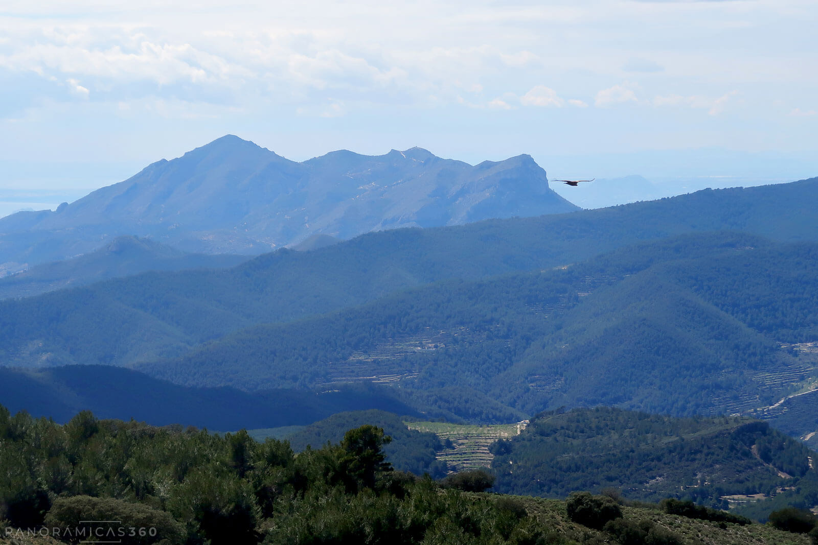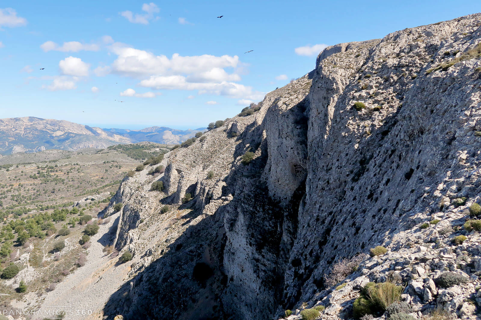 Antes de llegar a la cumbre me detengo a observar, primero el Cabeçó d’Or, cuya vista desde aquí me resulta novedosa, y después a un grupo de buitres que me sobrevuelan. Me quedo alrededor de cuarenta minutos disfrutando de su majestuoso vuelo, algunos pasan realmente cerca.