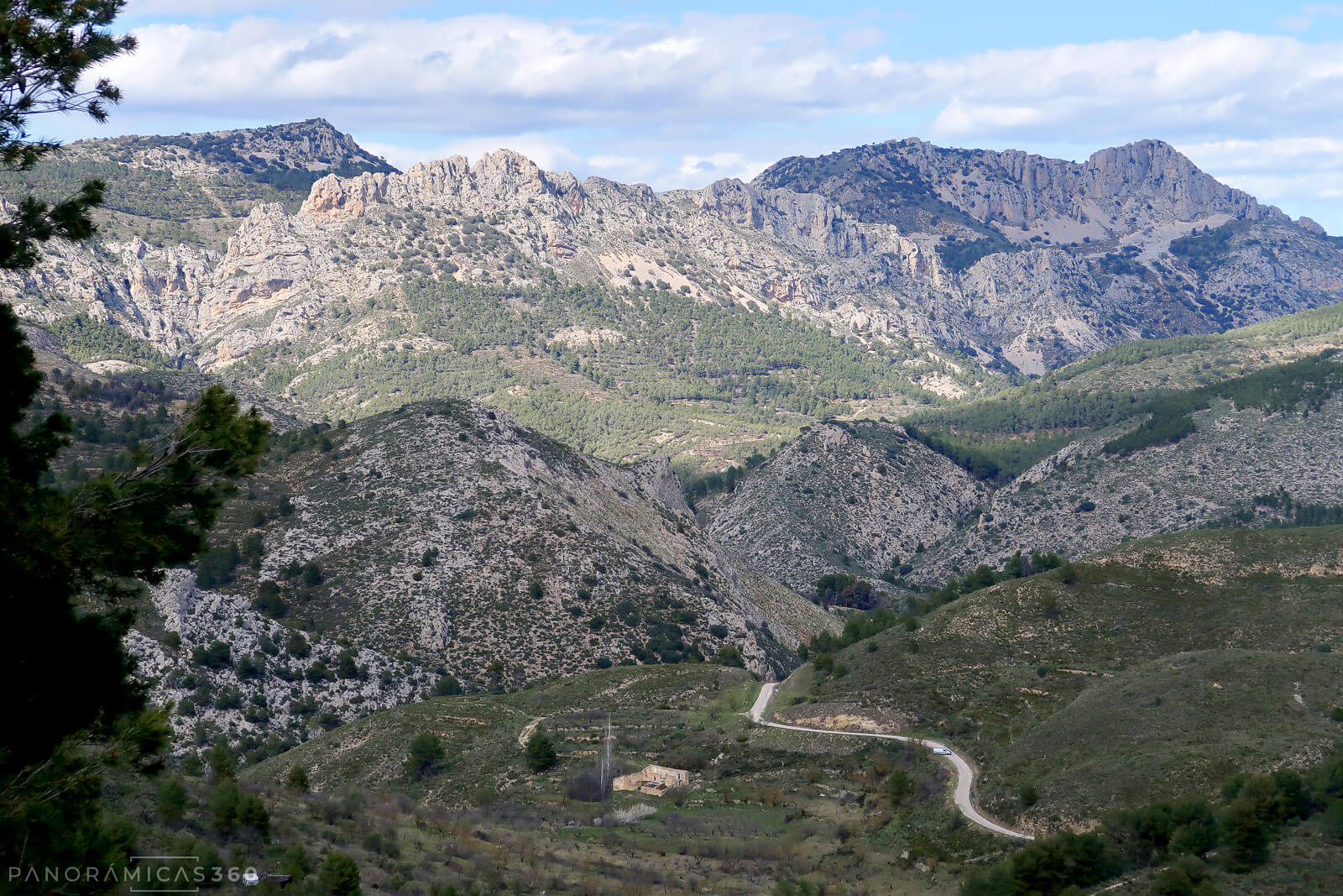 En un momento dado, la vista se abre y la agreste Sierra Serrella se muestra en toda su dimensión. En primer término reconozco la cresta dels Bardals y el barranco del Teular, que recorrí el 31 de diciembre de 2013 con un buen grupo de amigos. Me parece espectacular. Poco después alcanzo la collada de Xarquera, desde donde se divisa Alcoleja a lo lejos.
