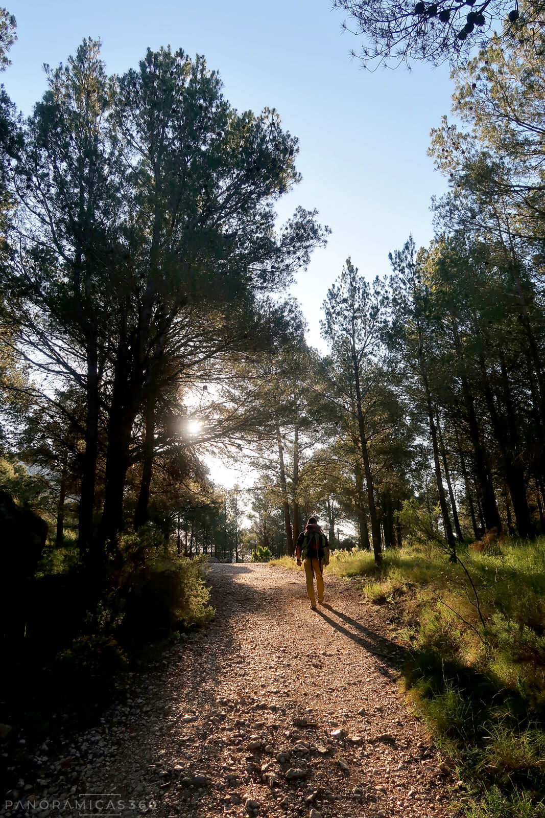 Repartimos el material, cargamos la mochila y empezamos a caminar. A los pocos metros nos desviamos por una senda evidente a mano derecha, señalizada con un hito. Tras una intensa subida llegamos al refugio de chapa «J. M. Vera» (del Centro Excursionista de Alicante) y, siguiendo el PR-CV 289, conocido también como Camí de la Serra, alcanzamos, con los primeros rayos del sol, el Coll del Pouet.
