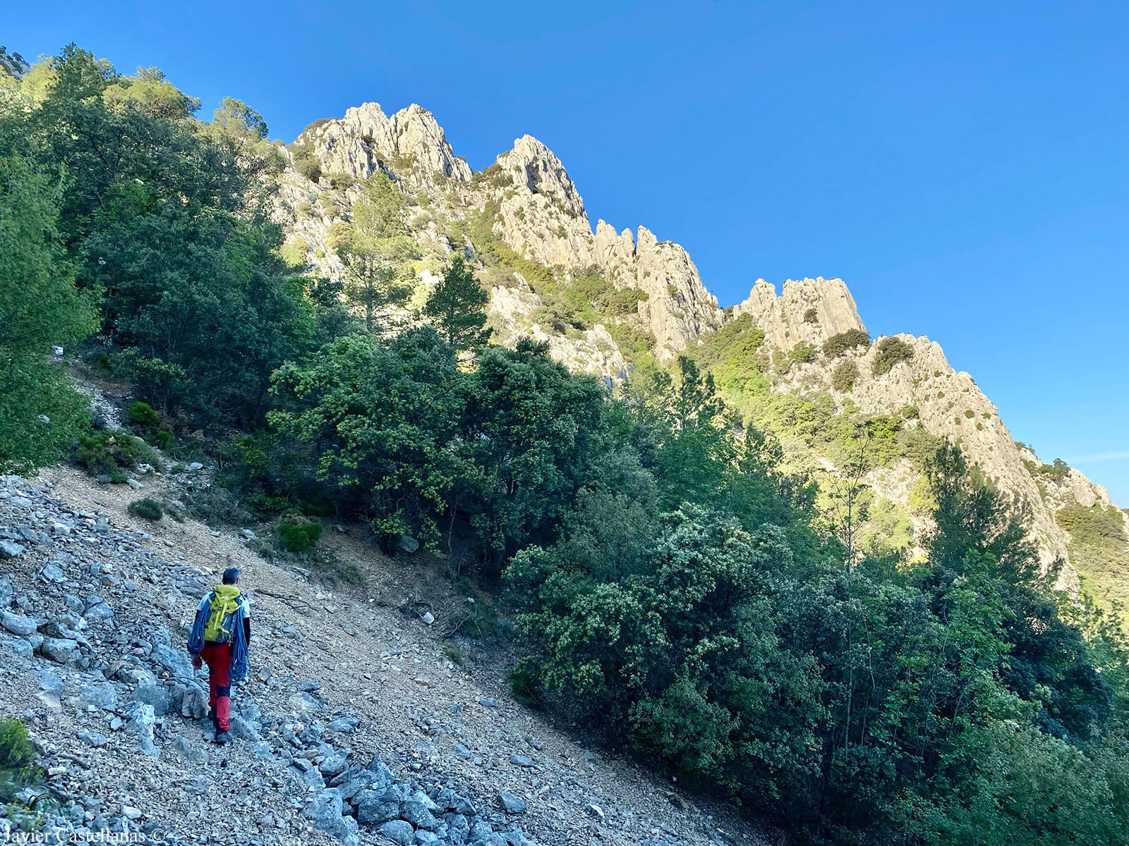 Algo más arriba abandonamos la pista balizada para tomar la senda que asciende a la cumbre por la vertiente norte. Continuamos por ella hasta un bosquete de carrascas, atentos para localizar el acceso al inicio de la arista, cuya parte inferior ya podemos ver desde aquí. Tomamos una trocha apenas marcada que desciende ligeramente hasta situarnos en la base de la vía, con cierta preocupación al comprobar que, pese a lo temprano del día, la cresta está completamente bañada por el sol. Parece que nos espera una jornada de calor y sed.