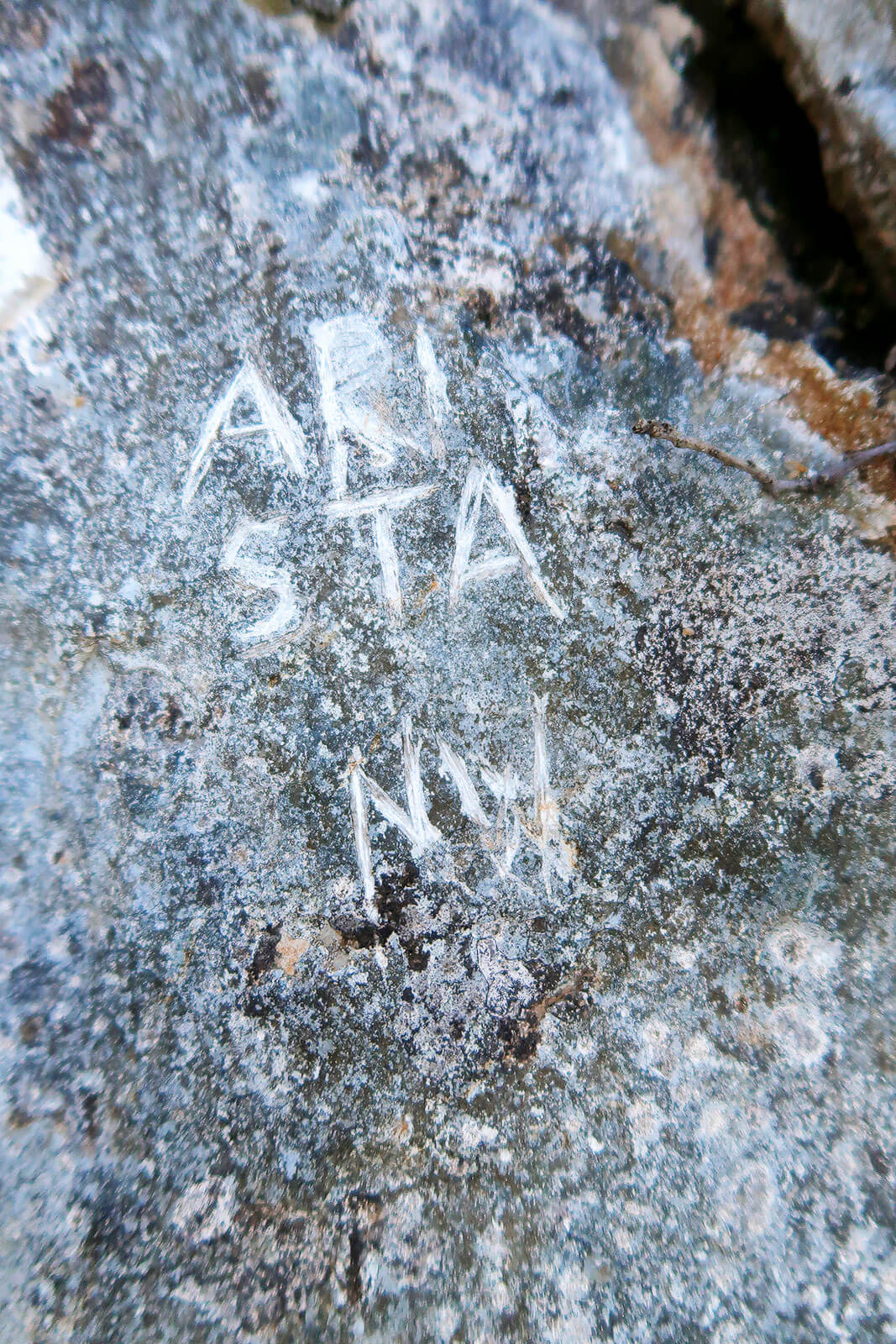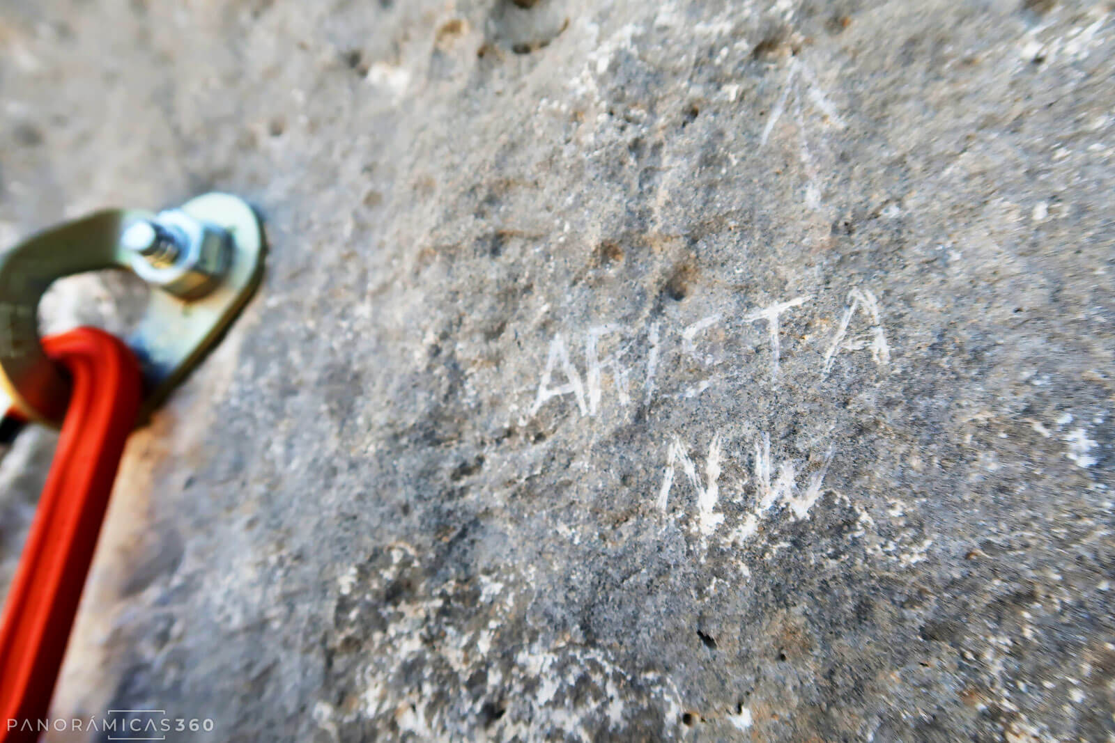 Tras poco más de una hora de caminata, estamos en el pie de vía, perfectamente identificable por el nombre picado en la roca.
