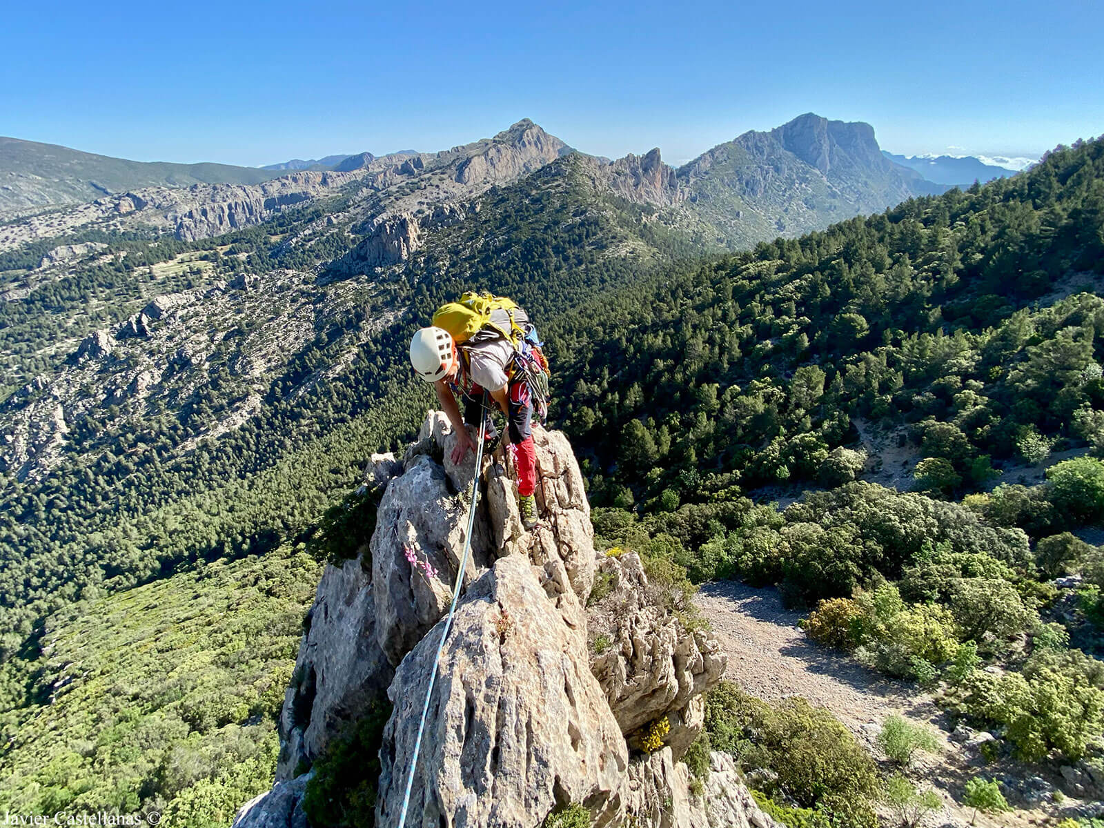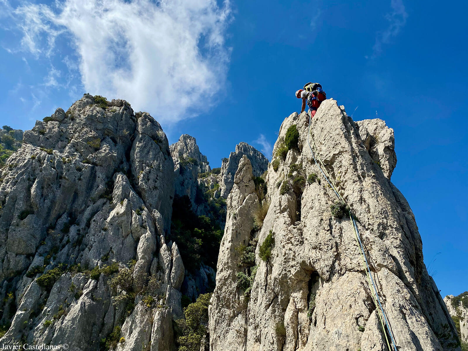 La arista Noroeste del Puig Campana (500 m, 6a) recorre una línea elegante y poco frecuentada, con tramos que alternan placas, crestas, gendarmes, travesías, diedros y un par de rápeles. Una escalada en roca sorprendentemente buena, en un entorno salvaje y solitario, perfecta para quienes buscan una gran actividad lejos de las rutas más transitadas.