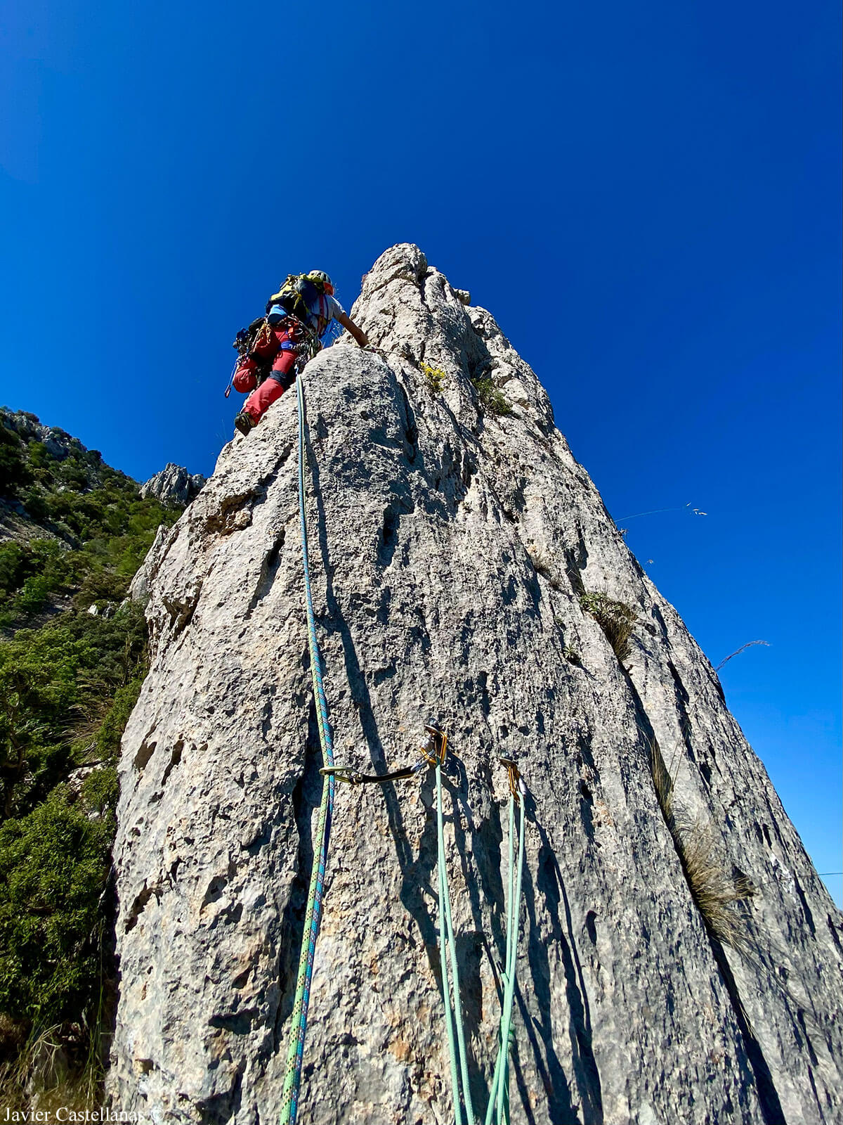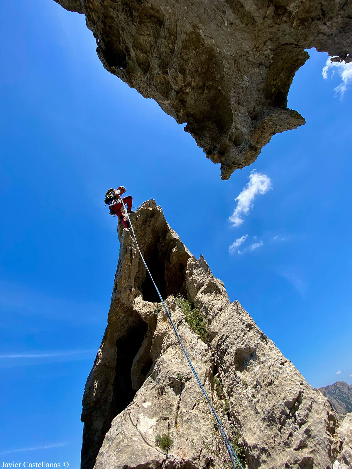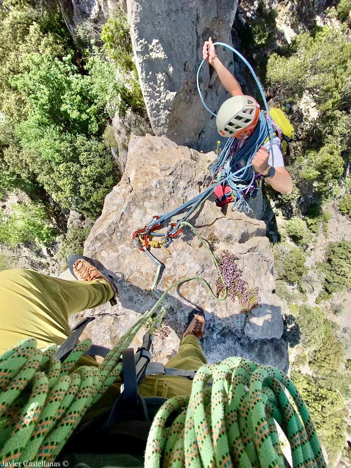 Desde este minúsculo pico rapelamos unos 15 metros en un bonito volado que nos deja en la siguiente aguja, donde un parabolt permite montar reunión. También a reforzar.