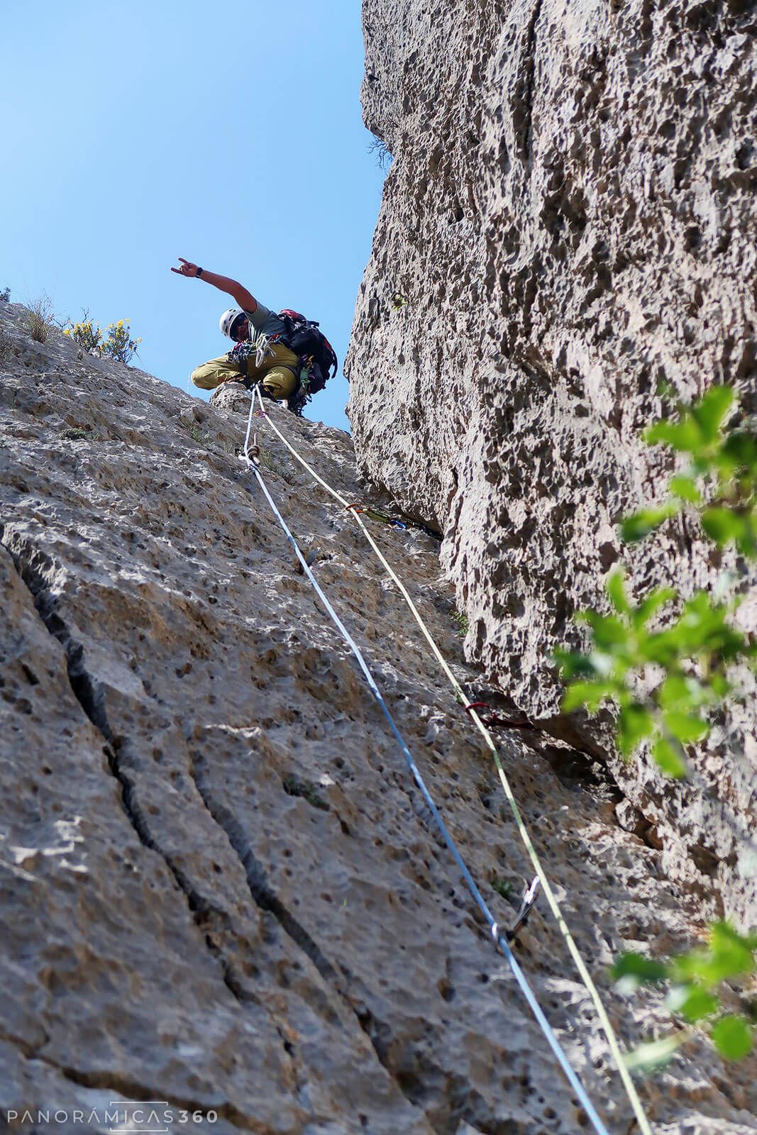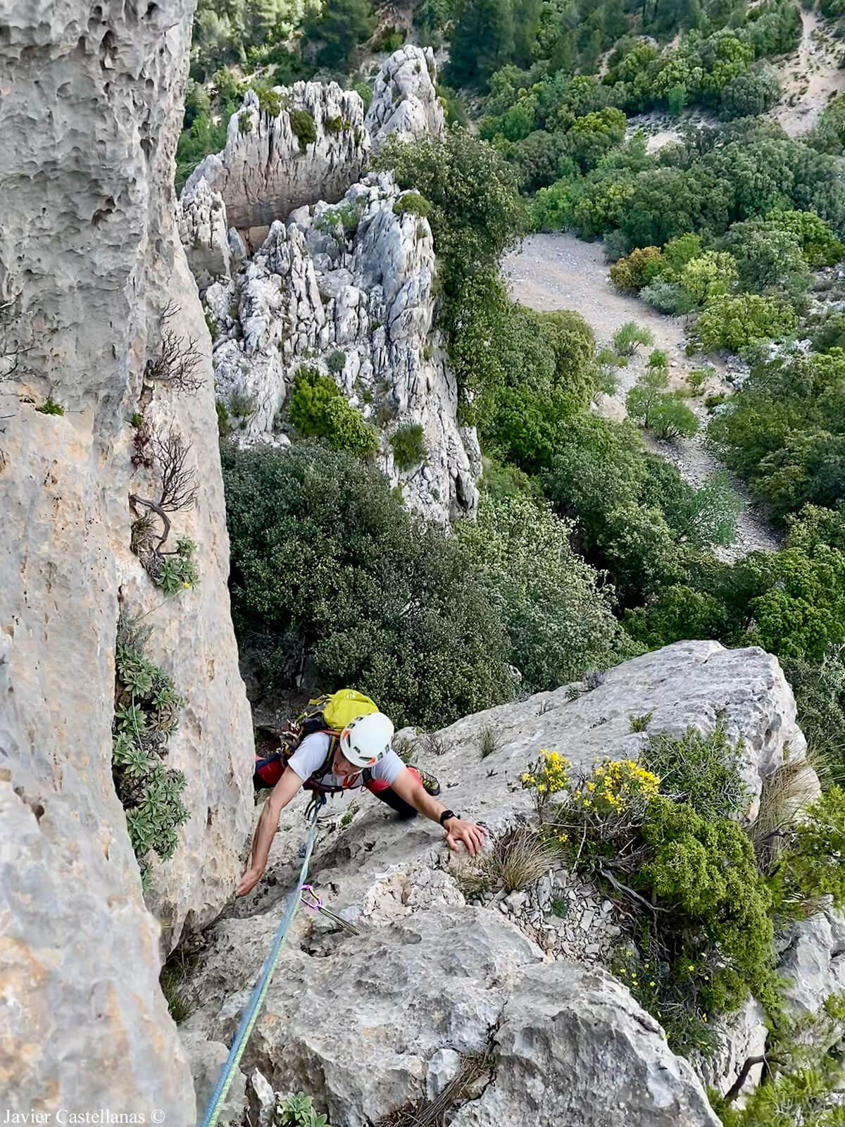 Superado este paso, atravesamos unas carrascas que llevan directamente a la base del siguiente largo, donde un parabolt, que habrá que reforzar, permite montar la reunión.