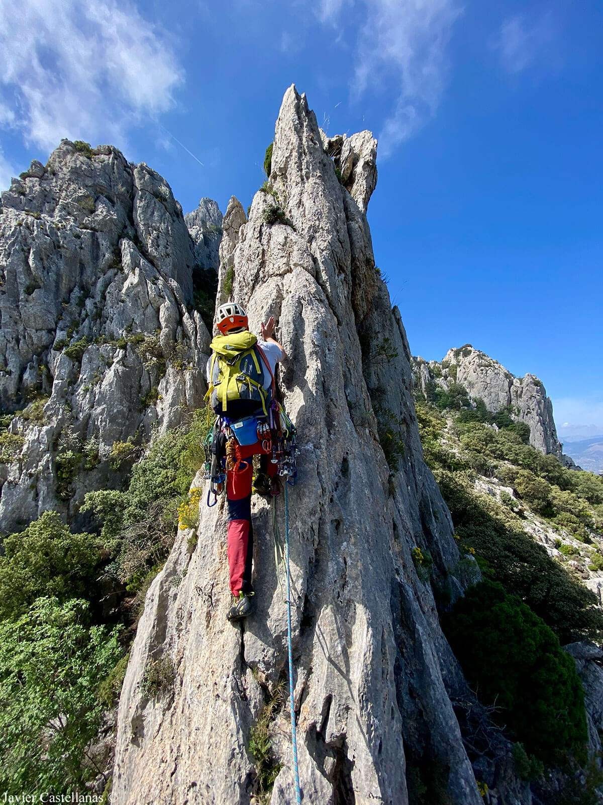 L2 (40 m, V+): Sigo como primero de cuerda. El inicio es por placa, para luego enlazar con una arista. Después hay que descender ligeramente para pasar por una curiosa brecha que separa dos agujas. No plantea más dificultad que alcanzar el otro lado, pero la altura del escalador es determinante, y a Javi le cuesta por este motivo.
