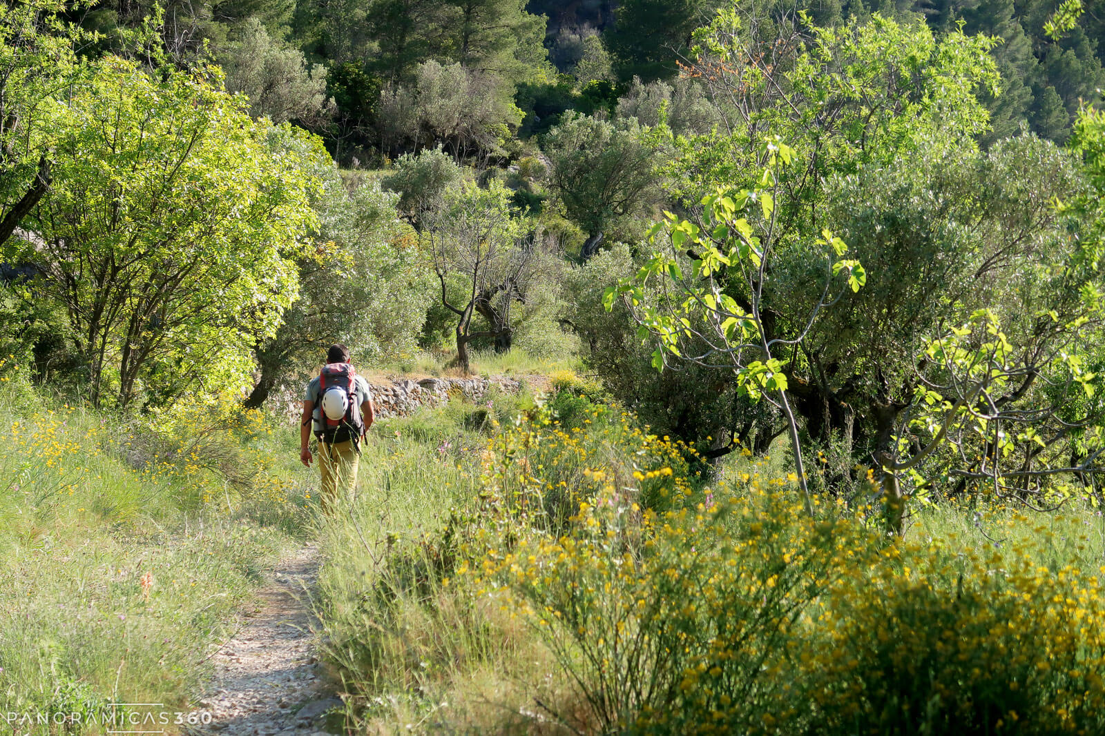 Después de tres kilómetros alcanzamos un cruce de pistas: a la izquierda podríamos regresar a Finestrat dando un rodeo, mientras que a la derecha se continúa hacia el Coll de Sacarest. Tomamos esta última. Doscientos metros más adelante aparece otra pista también a mano derecha que sube a una casa de piedra. Lo habitual es pasar junto a esa casa y aparcar donde termina el asfalto, pero nosotros seguimos un poco más por la pista, ahora de tierra, hasta una de las muchas terrazas agrícolas abandonadas que pueblan esta vertiente, muy cerca del Mas de l’Oficial.