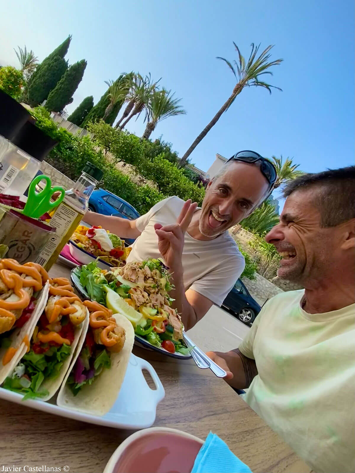 Con el estómago vacío y la sed olvidada, bajamos a Finestrat en busca de algo para comer. A estas horas (19:30 h) hay pocas opciones y acabamos en el Seasons, un bar inglés que nos sorprende con platos más sabrosos de lo que esperábamos (ya se sabe, la fama culinaria británica no juega a su favor). Nos sentamos en la terraza, todavía al sol -como si no hubiéramos tenido suficiente- y brindamos por la jornada. Un merecido festín para cerrar de la mejor manera posible una intensa y solitaria actividad en la Arista Noroeste del Puig Campana. ¡Hasta otra!