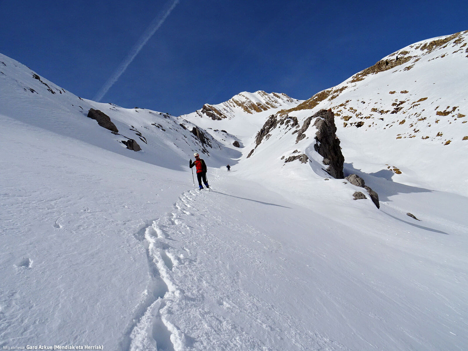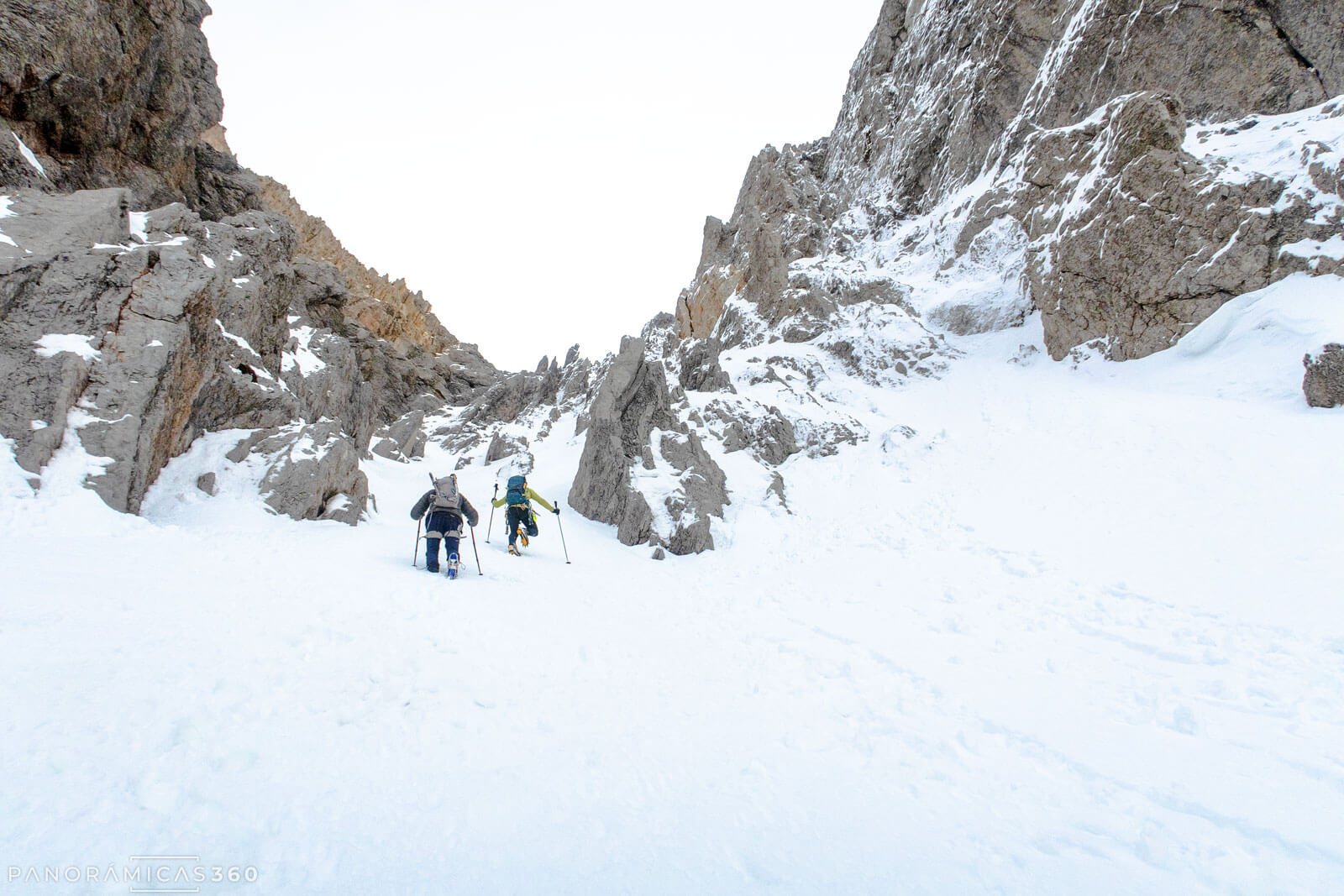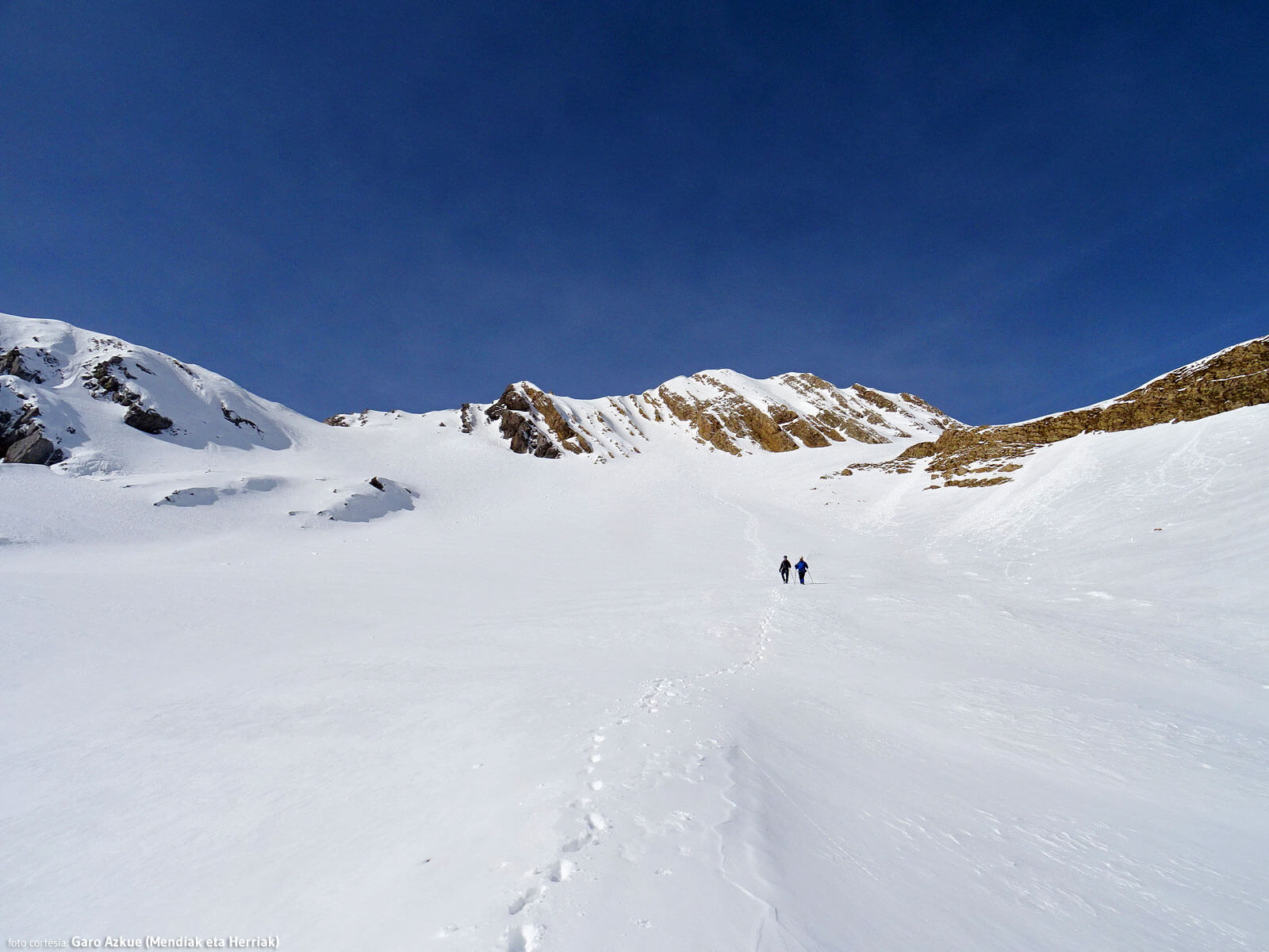 Al fondo a la derecha, escondido de la vista tras varias rocas, se encuentra nuestro objetivo. La línea donde comienza no es visible hasta que estamos prácticamente encima, además la inclinación apenas cambia, así que ojo con ir a otro corredor más a la izquierda, ya que conduce a una afilada arista que habría que escalar para salir a la cumbre. Mikel y yo no tenemos que pensar mucho, es Garo quien nos guía, él conoce el terreno y sabe por dónde continuar.