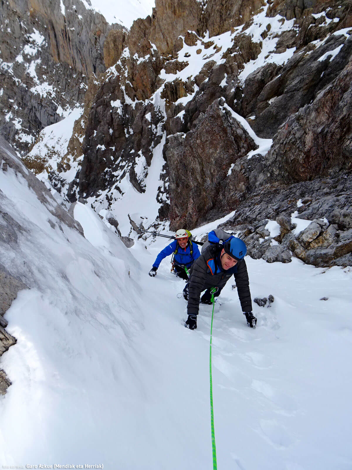 La emoción de la cumbre no dura mucho, aún tenemos que bajar al valle y se trata de una bajada no exenta de dificultades. Los primeros metros hasta llegar a la entrada del corredor este, son los más delicados. Destrepo el primero seguido de Mikel, mientras Garo nos asegura. Una vez en el corredor (que tiene tanta inclinación y longitud como el que hemos subido) bajamos poco a poco de cara a la pendiente.