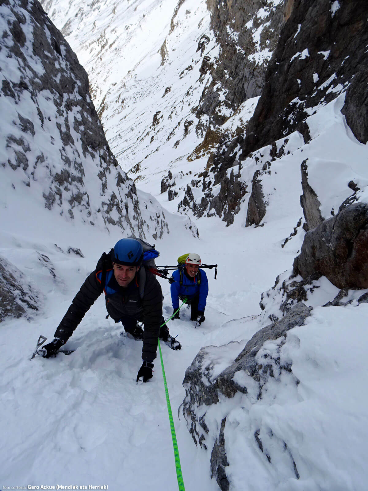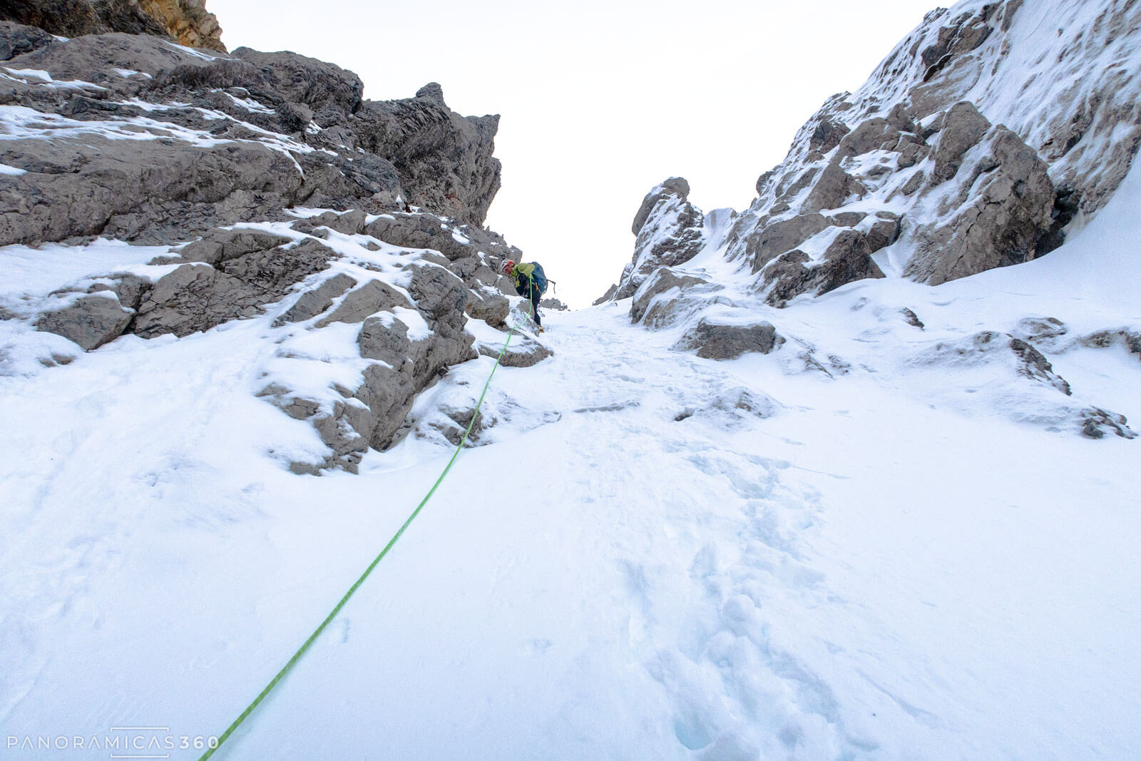 Llegamos a un estrechamiento con un pequeño resalte de hielo donde nos encordamos. Garo lo escala y nos asegura desde arriba. Una vez superado seguimos en cuerda corta remontando los 200 ó 300 metros restantes de corredor. Las condiciones son buenas y avanzamos sin complicaciones hasta la salida.