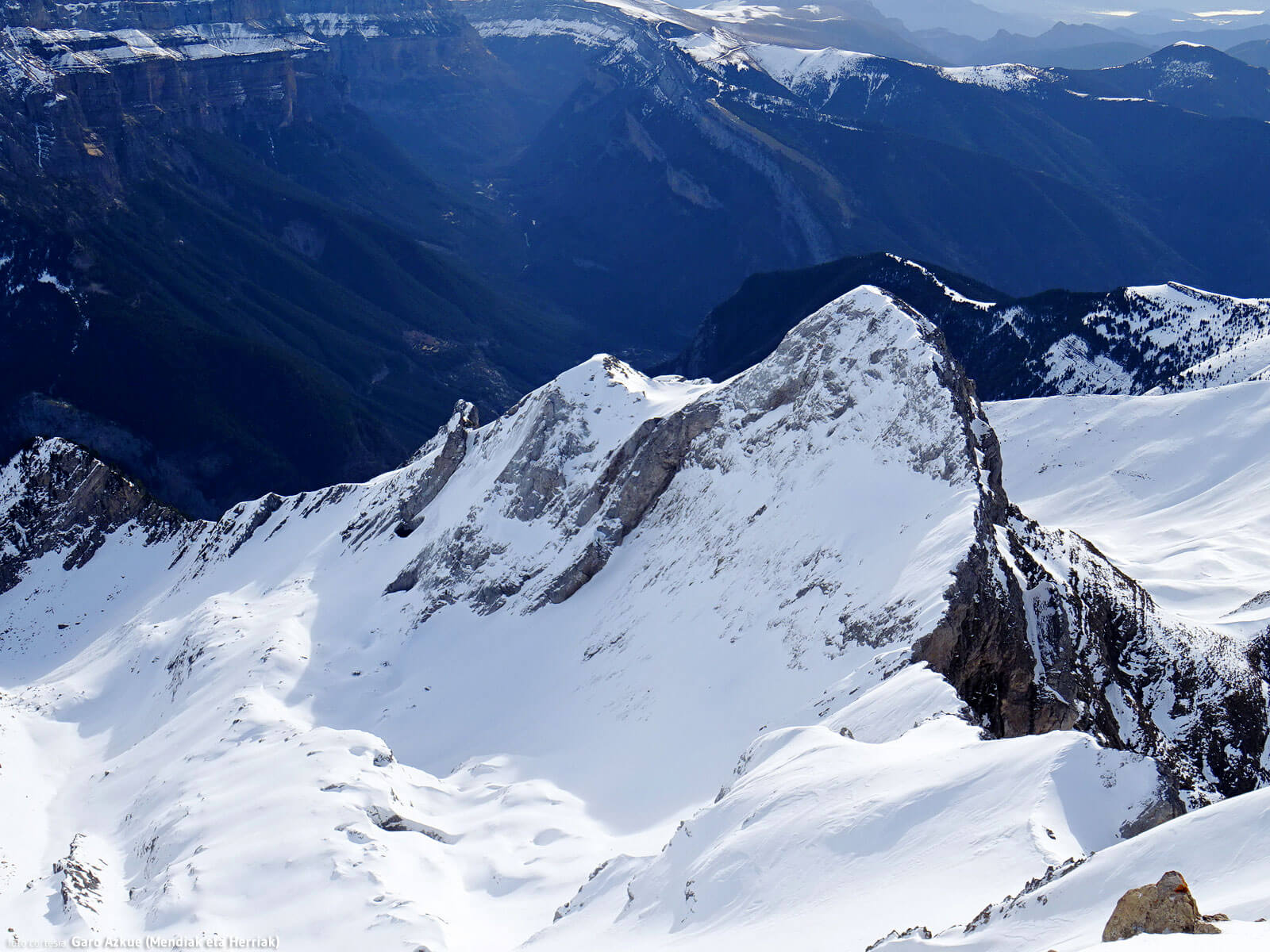 El Pico Otal, también conocido como Peña de Otal o Arañonera, cuya cima piramidal se eleva cerca de 1.500 metros desde el valle de Bujaruelo, es la segunda cumbre más alta de la Sierra Tendeñera en el Pirineo aragonés. Se trata de un monte poco frecuentado por tres motivos: está aislado, subirlo desde cualquiera de sus vertientes es una tarea exigente tanto física como técnicamente, y no supera los 3.000 metros de altura. En este artículo cuento la escalada invernal de su corredor oeste y la posterior bajada por el corredor este hacia Bujaruelo.