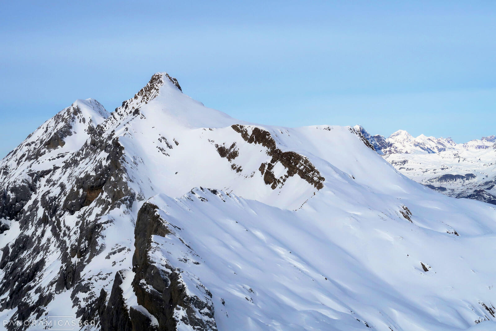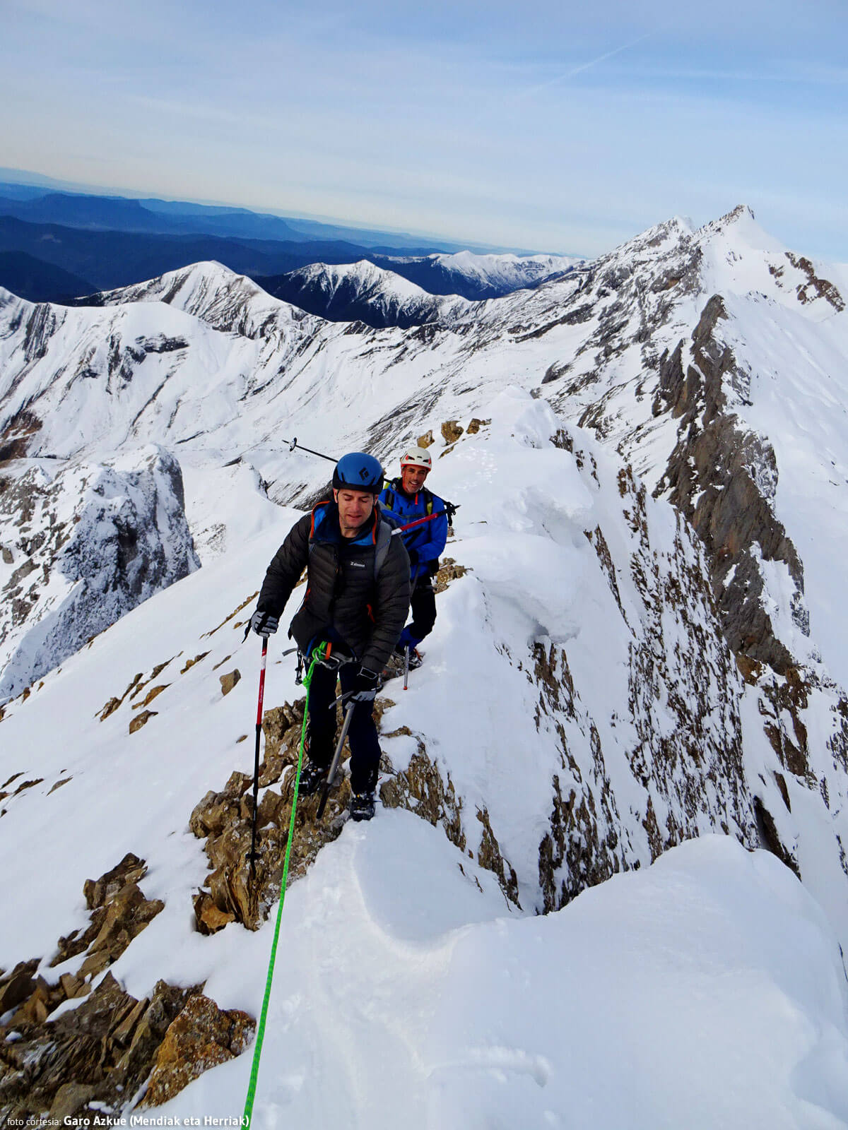 Una vez fuera del corredor tenemos por delante la pala final con nieve muy dura, alguna placa de hielo y bastante inclinación. Es un tramo aéreo y muy delicado en el que un fallo nos lanzaría al abismo, así que no caben errores. Subimos concentrados hasta un hombro y desde allí siguiendo una cresta ligeramente afilada, a la cumbre.