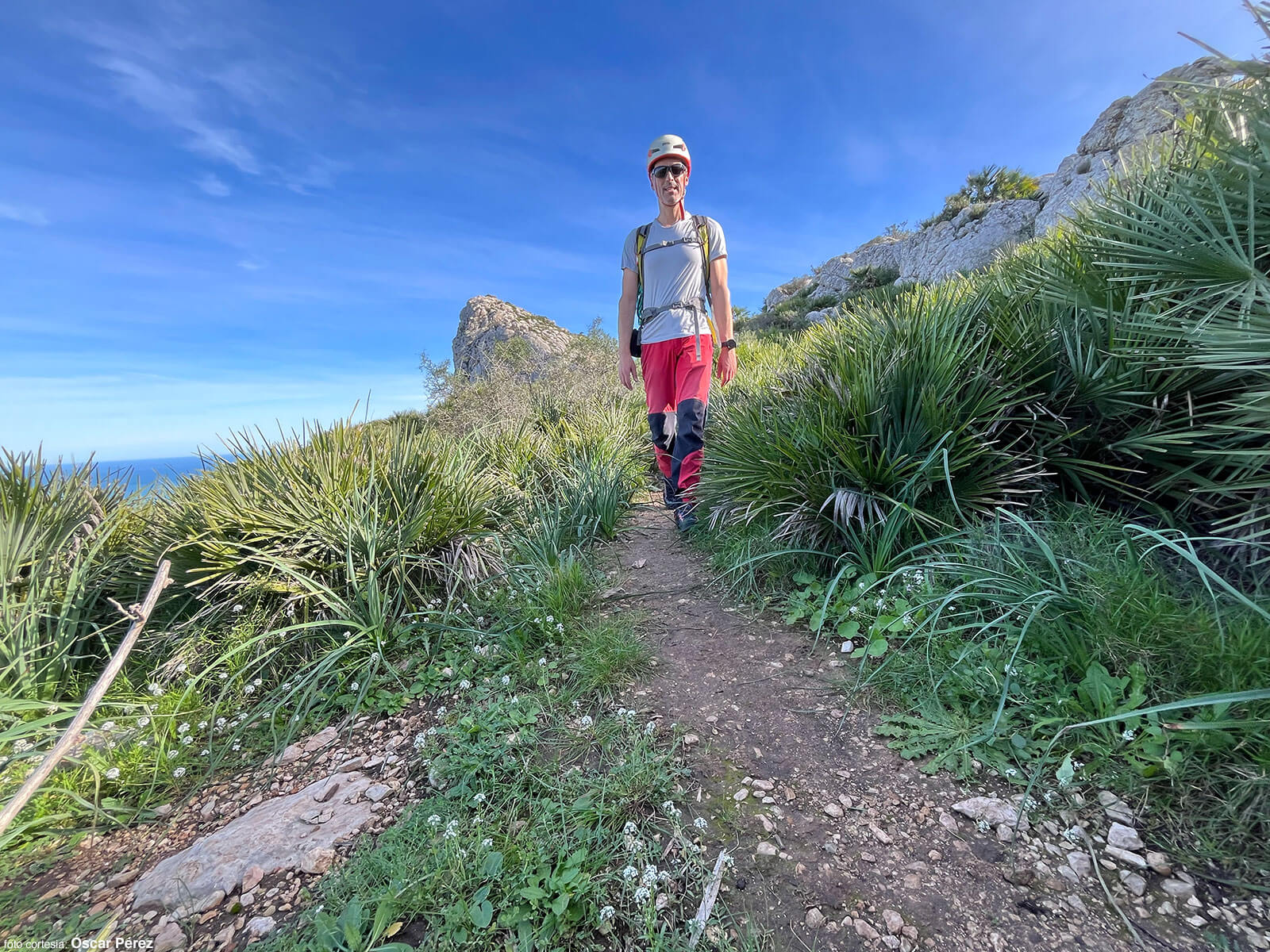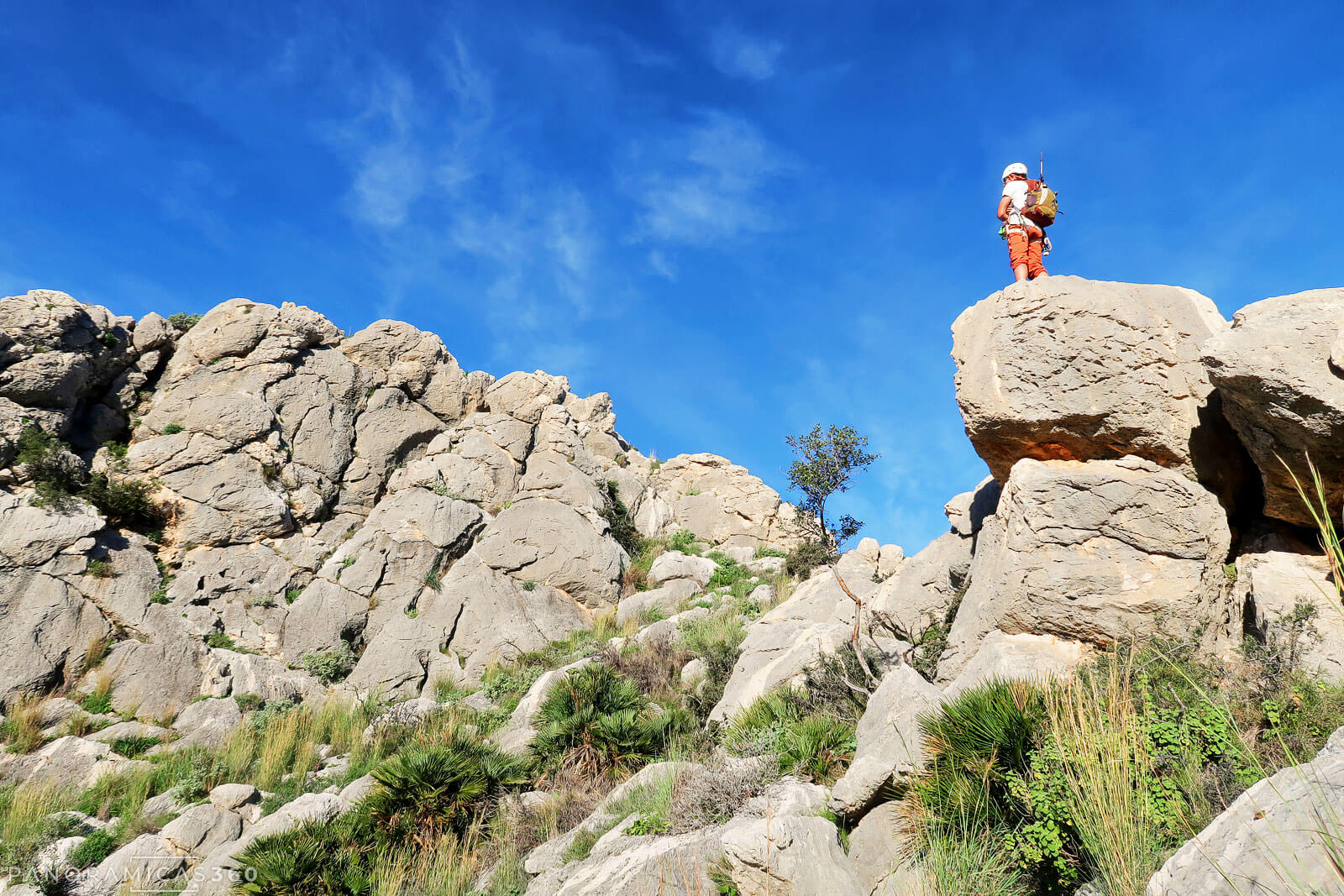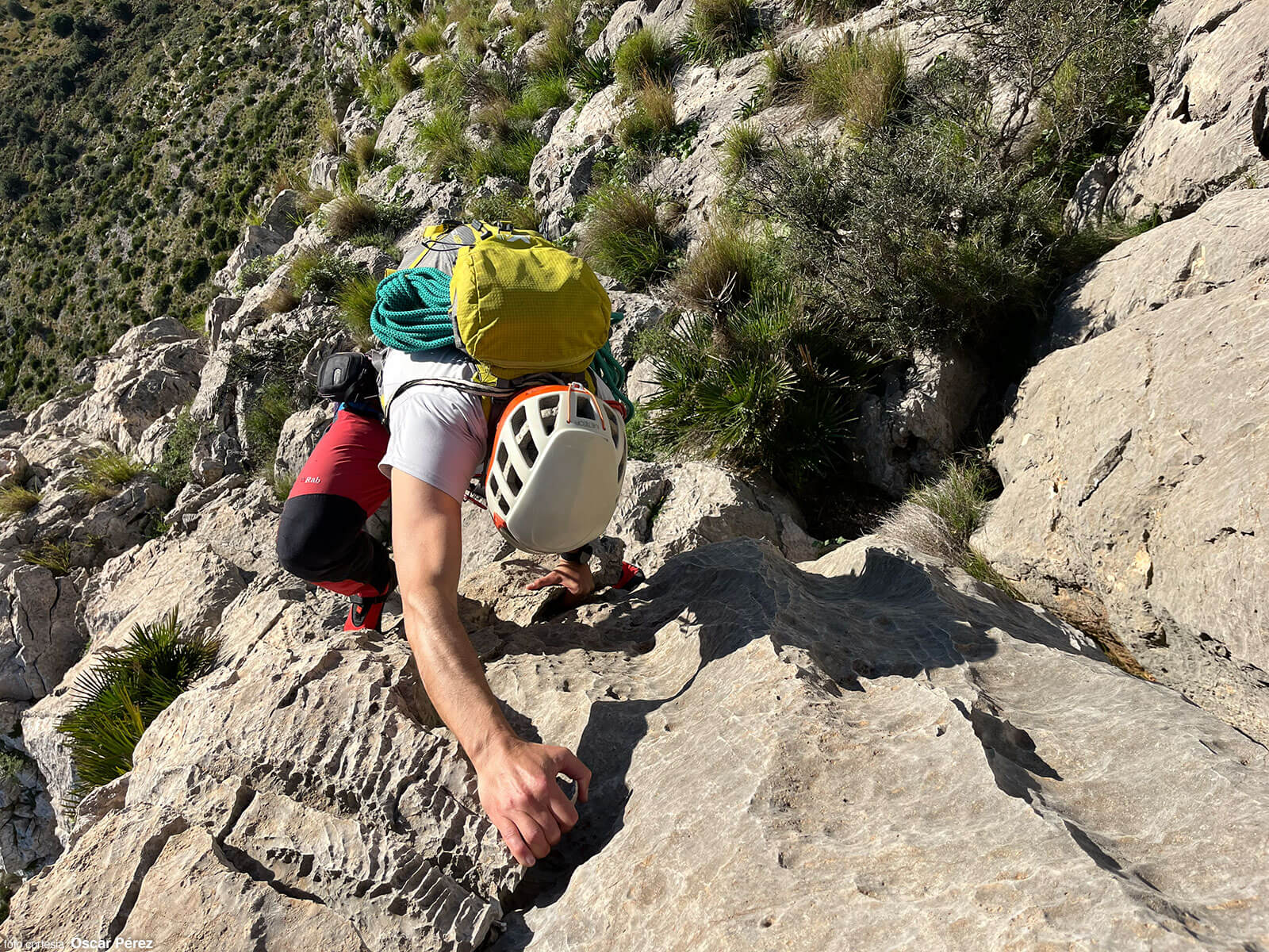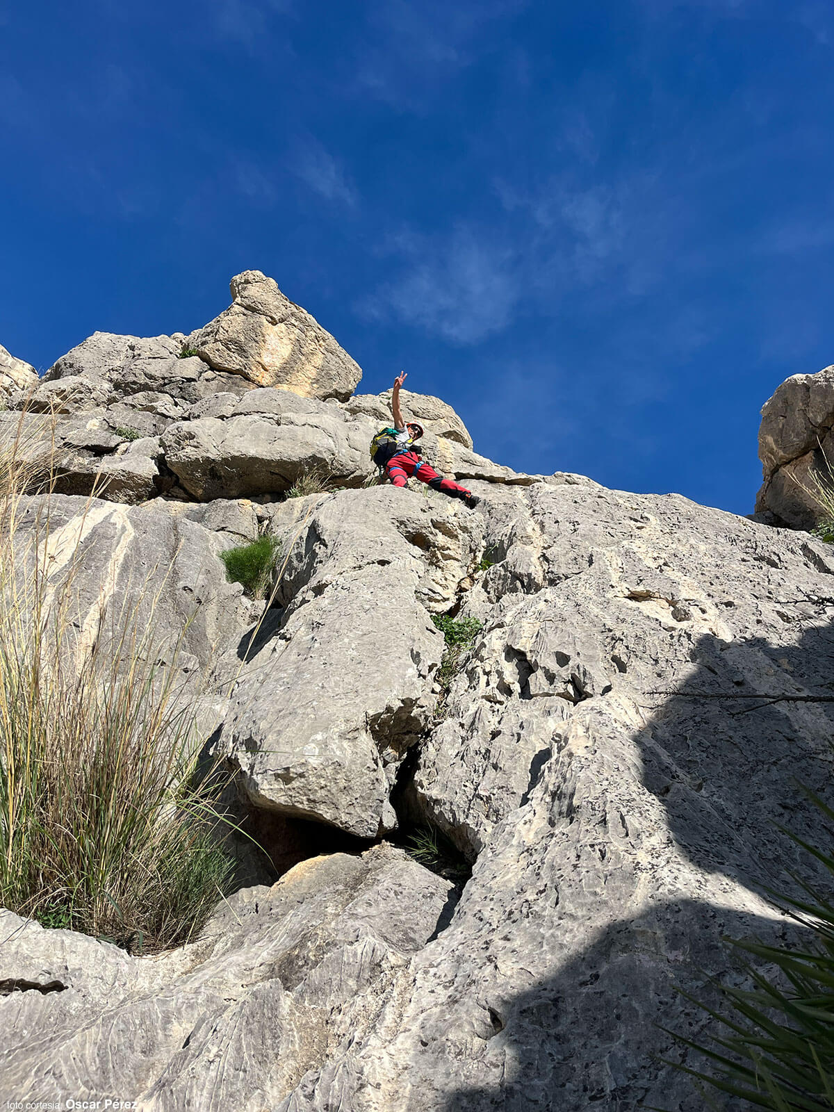 Al cambiar de vertiente, tomamos un desvío a la izquierda que poco a poco se difumina y avanzamos en diagonal por pura intuición. Entre palmitos y bloques de caliza (III), ganamos altura hasta una repisa ancha junto a una pared vertical. Este balcón natural conduce al primer paso clave de la cresta: una travesía horizontal (IV+) protegida con un clavo y un puente de roca.
