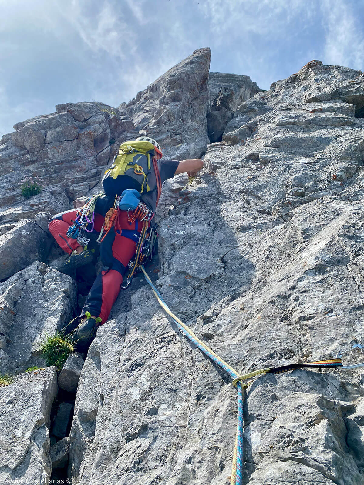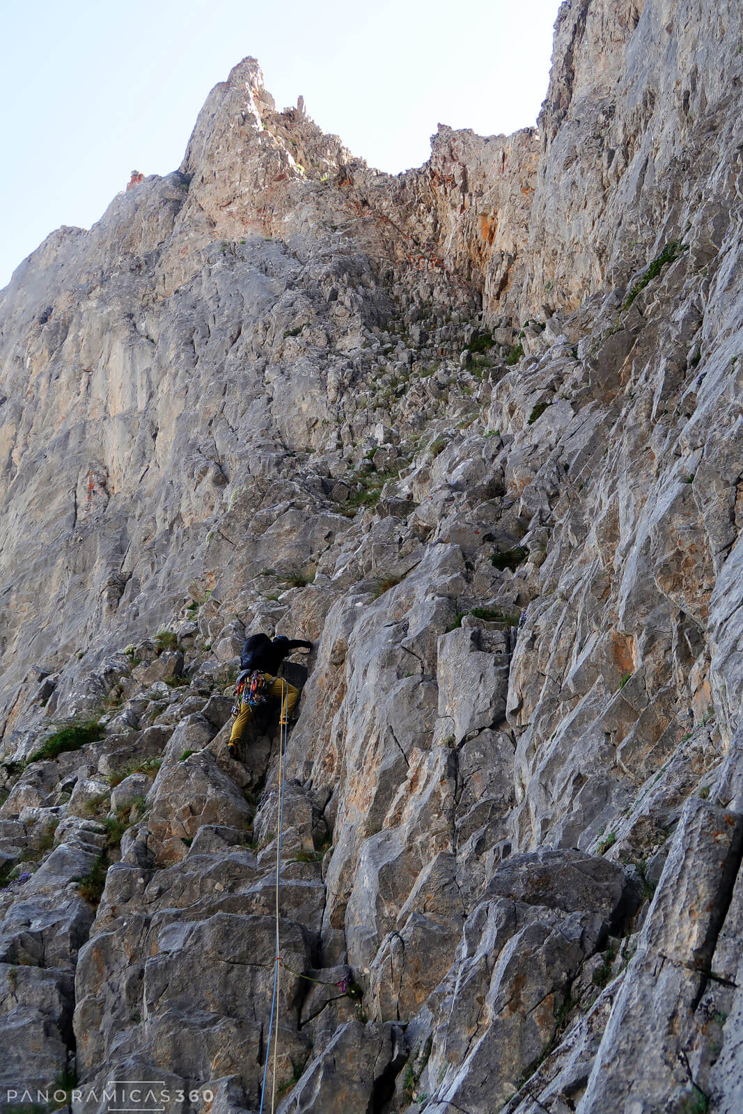 El primer largo hace una larga diagonal desde la base, buscando la característica “V” de la arista. Técnicamente es fácil, pero la roca está muy rota, sobre todo por arriba, y resulta psicológicamente agotador; al menos, para mí lo es. Llego a la reunión con un estado mental deplorable, del que no termino de recuperar hasta casi el final de la vía.