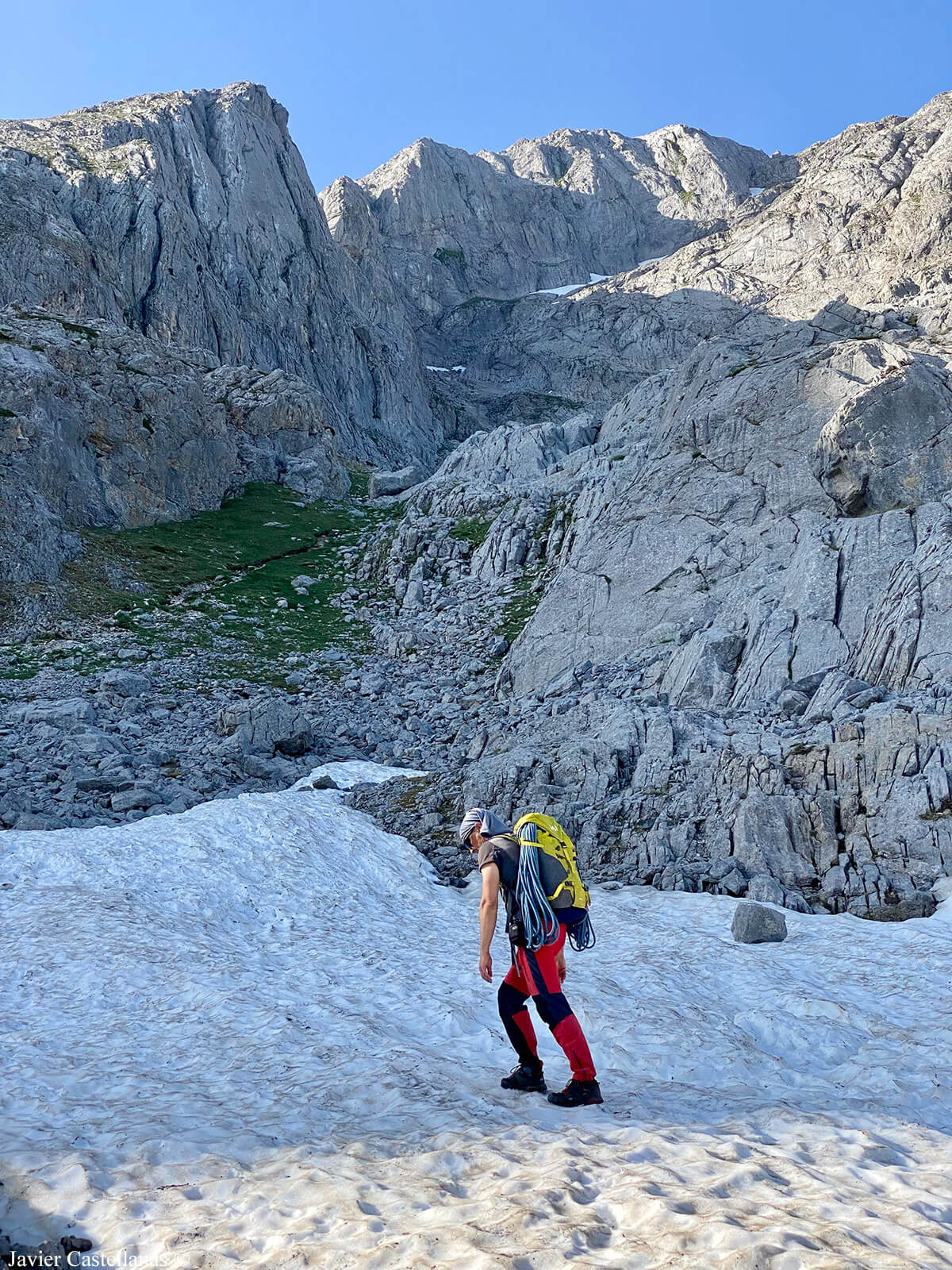 Entre la charla y lo absortos que vamos con el entorno, pasamos de largo la entrada al corredor y tomamos sin querer el sendero que sube hacia la Sima del Anillo. Eso nos obliga a dar un pequeño rodeo y cruzar un nevero para volver al itinerario correcto. En apenas dos horas alcanzamos la base de la característica “V” que marca el inicio del Espolón Norte.