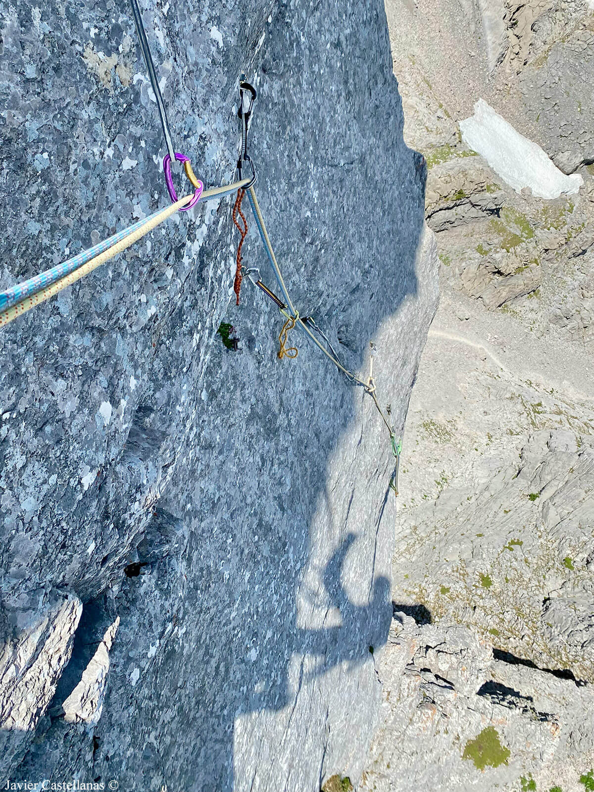 Poco después de la placa llegamos a un pequeño rellano inclinado donde se encuentra la reunión, equipada con parabolts y dos anillas que, según he leído, permiten rapelar al circo en un rápel de 60 metros. El resto de la bajada continúa por la canal que sale al este del espolón, pero nosotros seguimos hacia arriba.