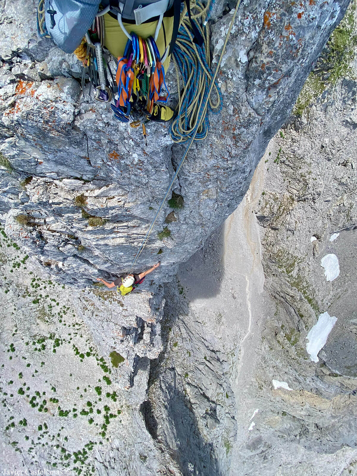 Hemos traído un estribo para superar el largo, pero Javi, que va de primero, prescinde de él. No pretende liberarlo, pero confía en que con la ayuda del antipanic podrá resolverlo, y efectivamente, así es. A mí me deja algunas cintas largas para traccionar, y el estribo no sale de la mochila.