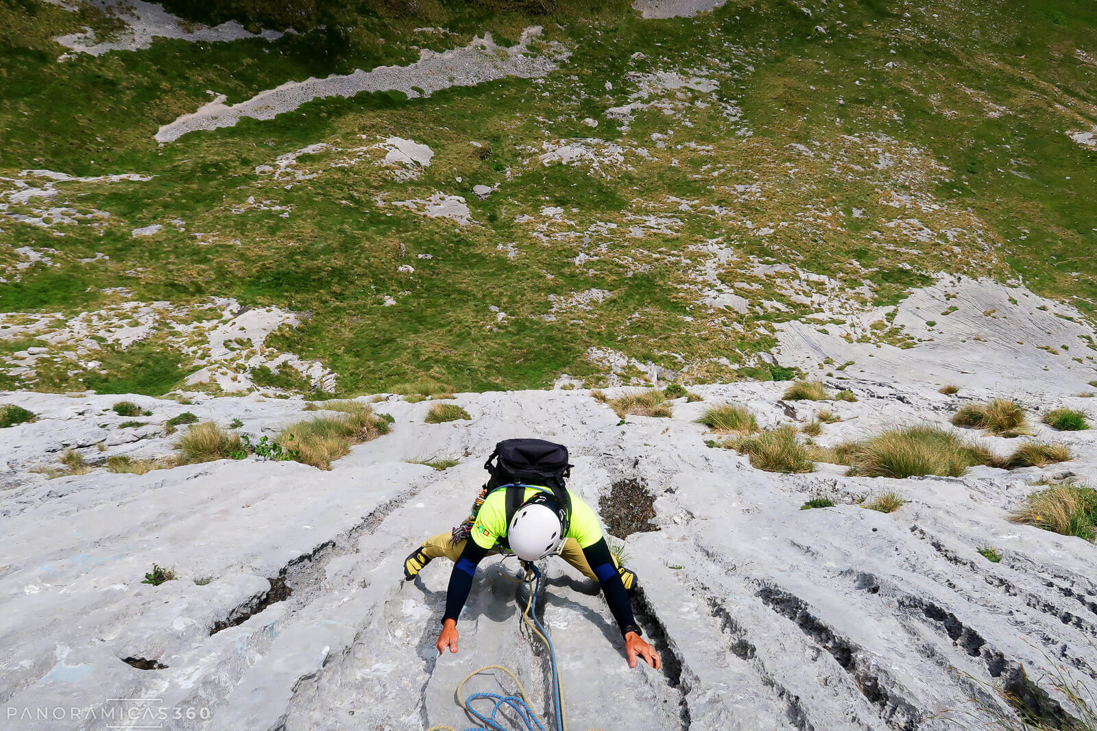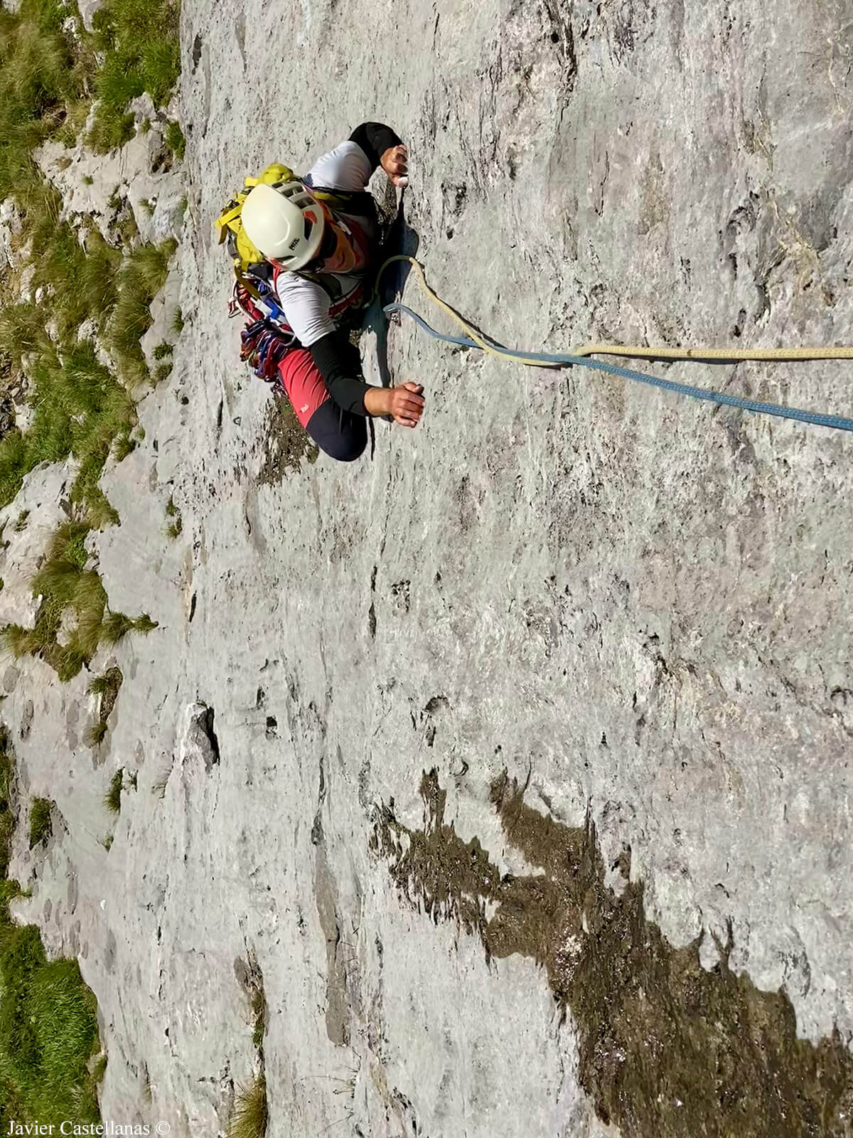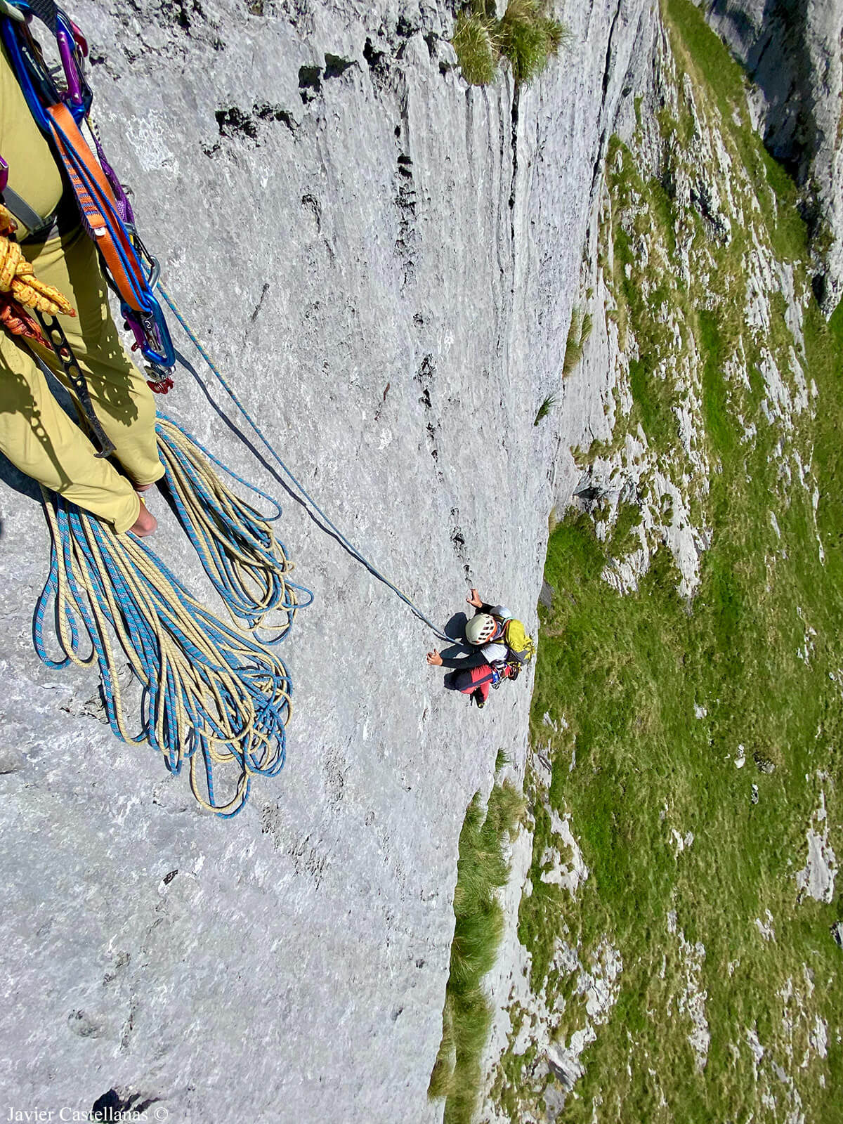 L7 (50 m, IV+): Para corregir mi error, Javi sube hasta la base del techo y lo recorre hacia la izquierda en travesía. Cuando llega a la base de un espolón evidente, improvisa una reunión intermedia.