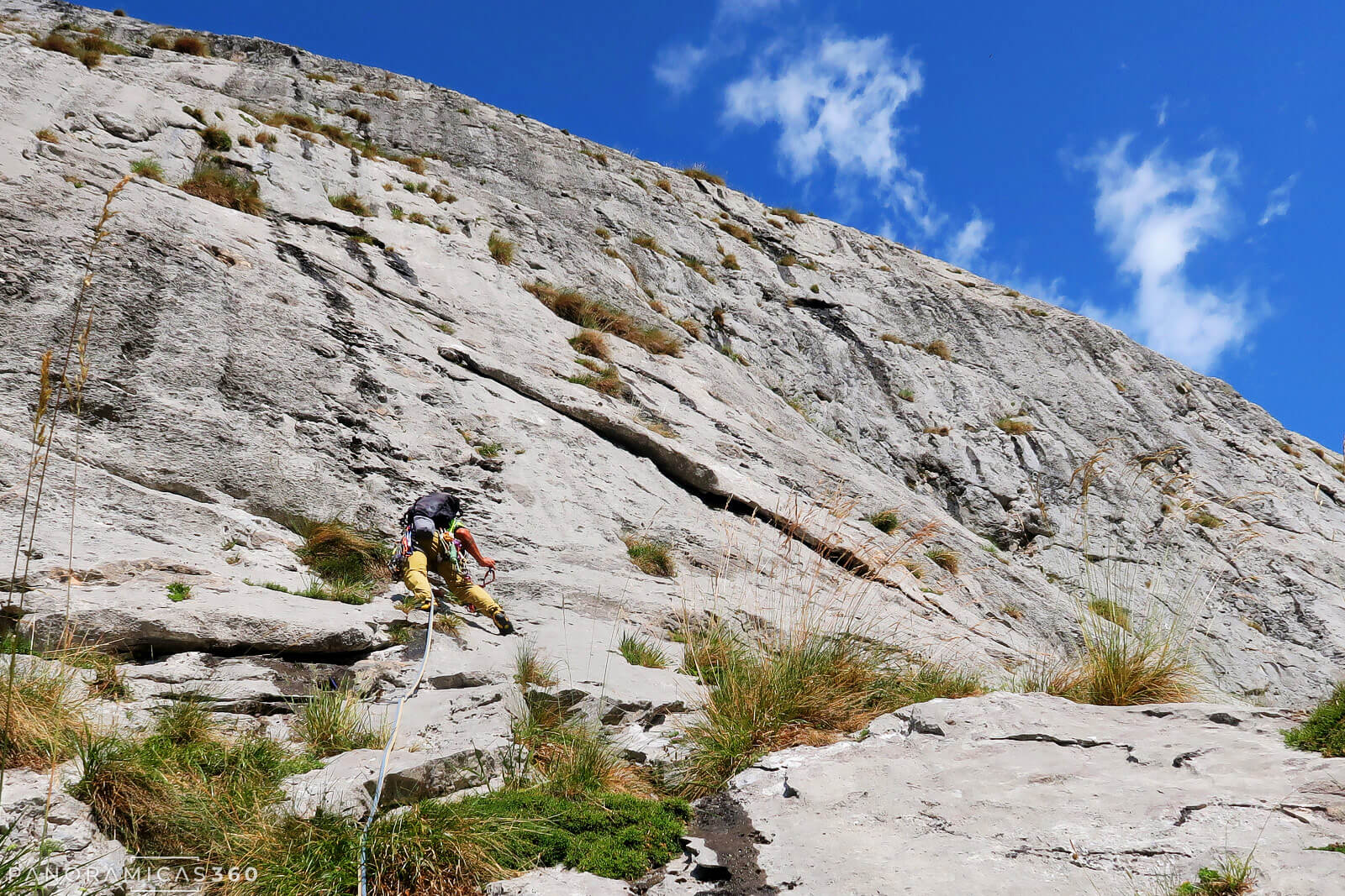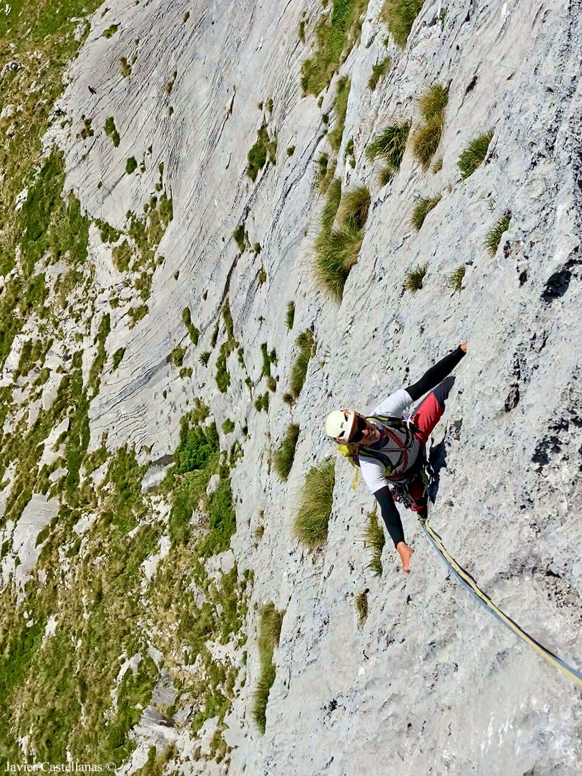 L6 (45 m, IV): Un largo en el que resulta fácil perderse entre el mar de canalizos. De hecho, me voy demasiado a la derecha y termino en la reunión de otra vía, unos metros por debajo del techo característico.