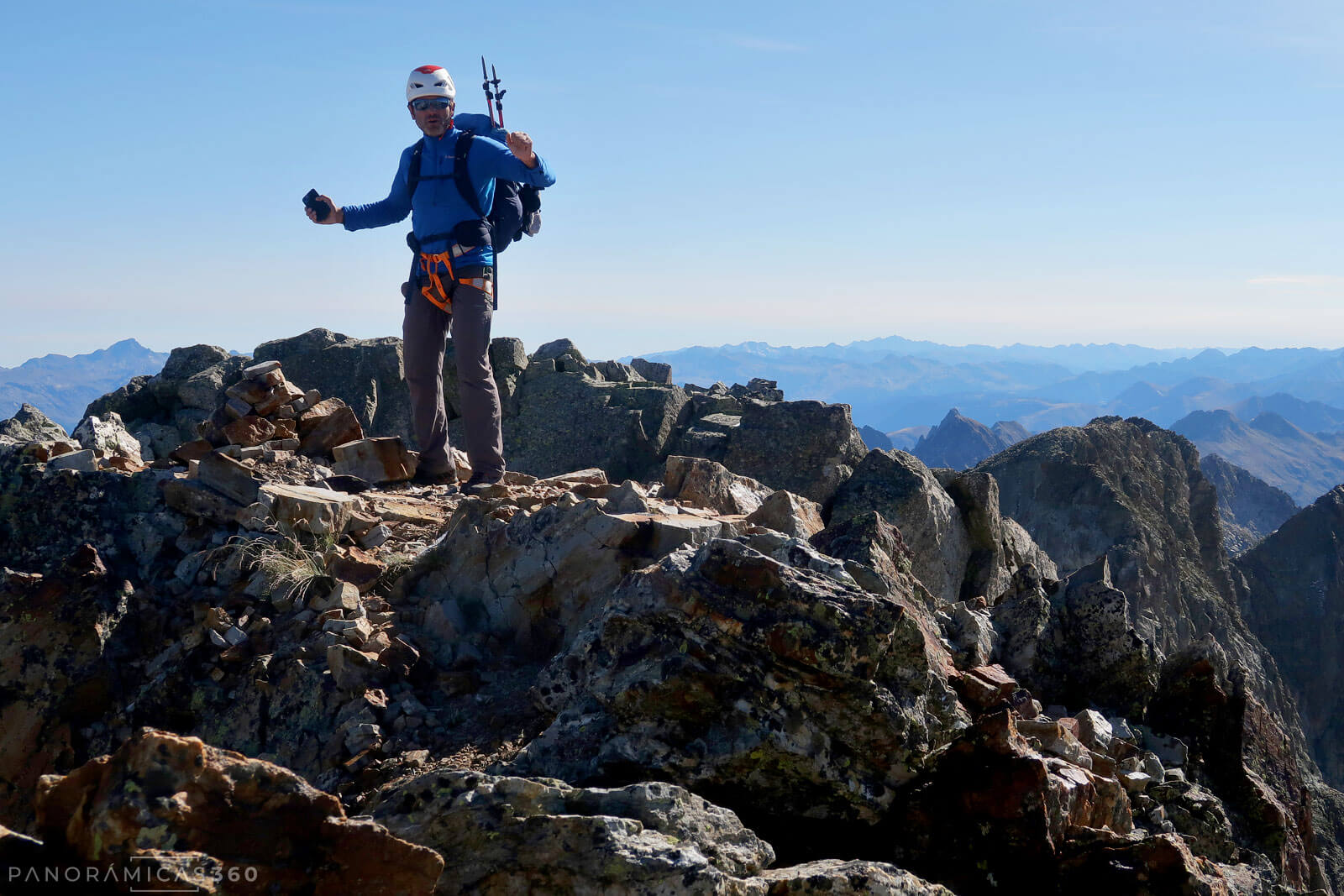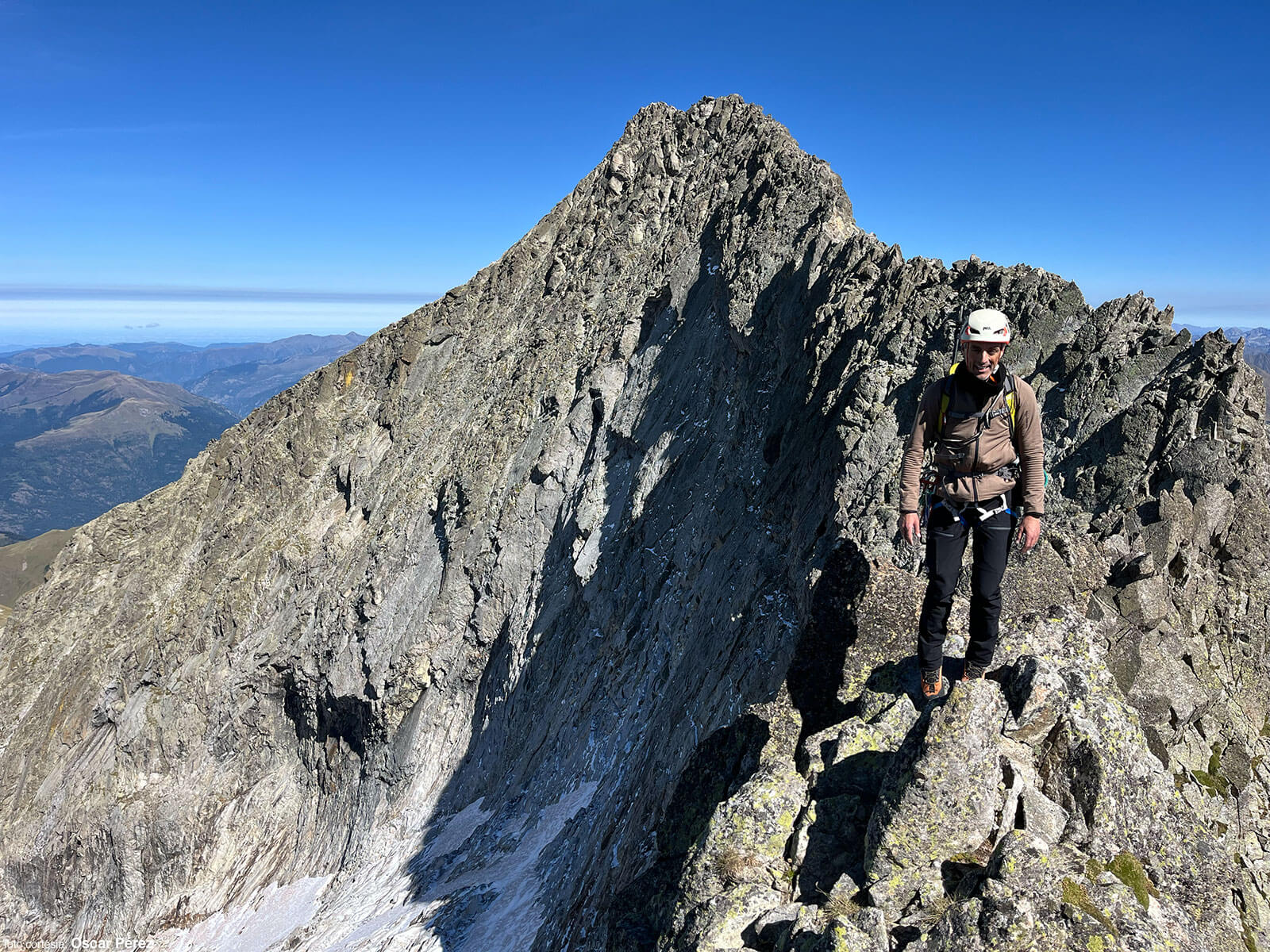 Tras recuperar fuerzas, acometemos lo que resta hasta la cumbre. No soy consciente de haber superado el Mal Paso (Mauvais Pas) que da nombre al pico. Si lo hemos superado, no he sido consciente. En cualquier caso, realizamos varias trepadas que se intercalan con tramos de pedregal hasta salir a la cumbre, donde nos cruzamos con la única persona que vamos a ver en toda la jornada, un francés bastante majo que viene del valle de Lis.