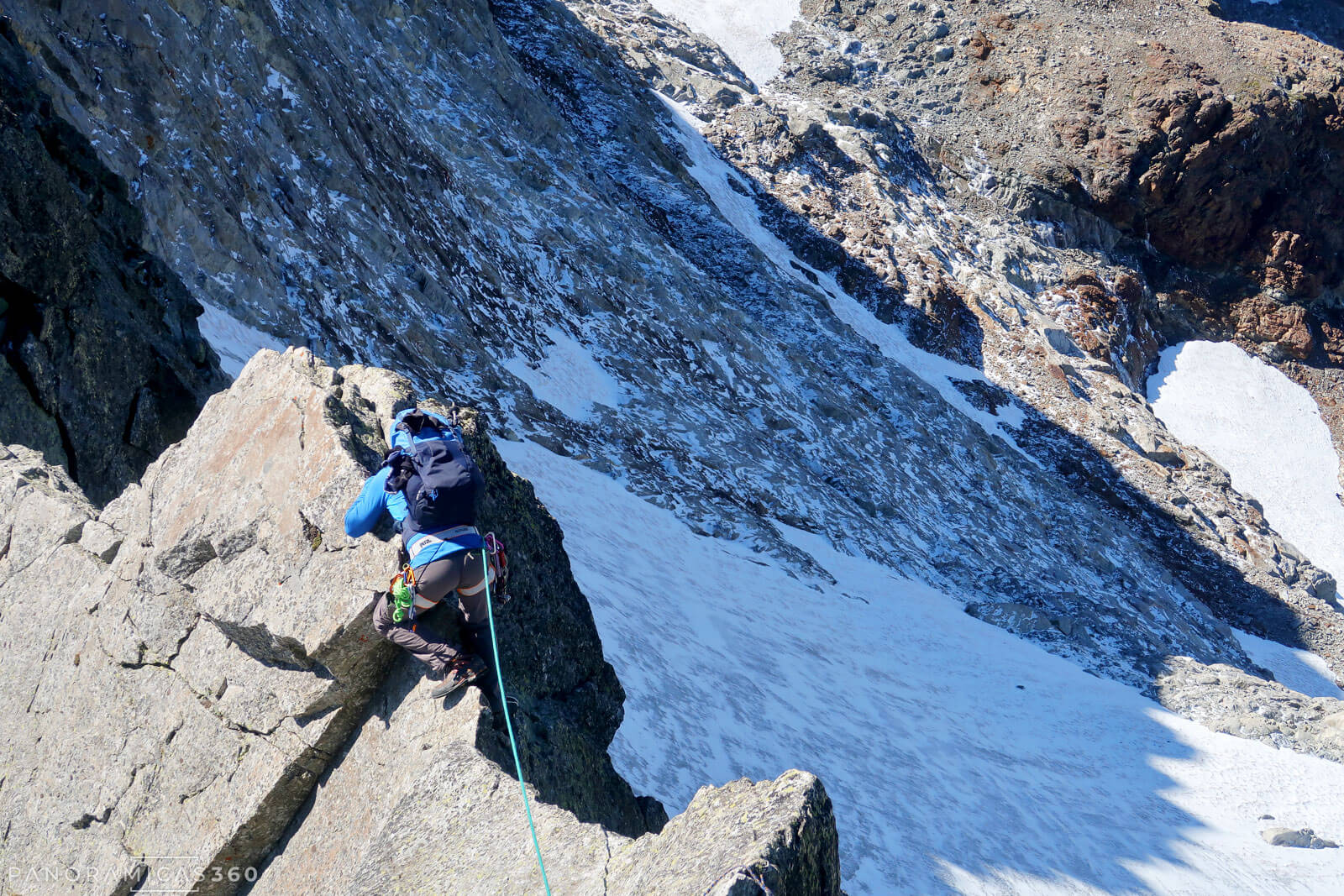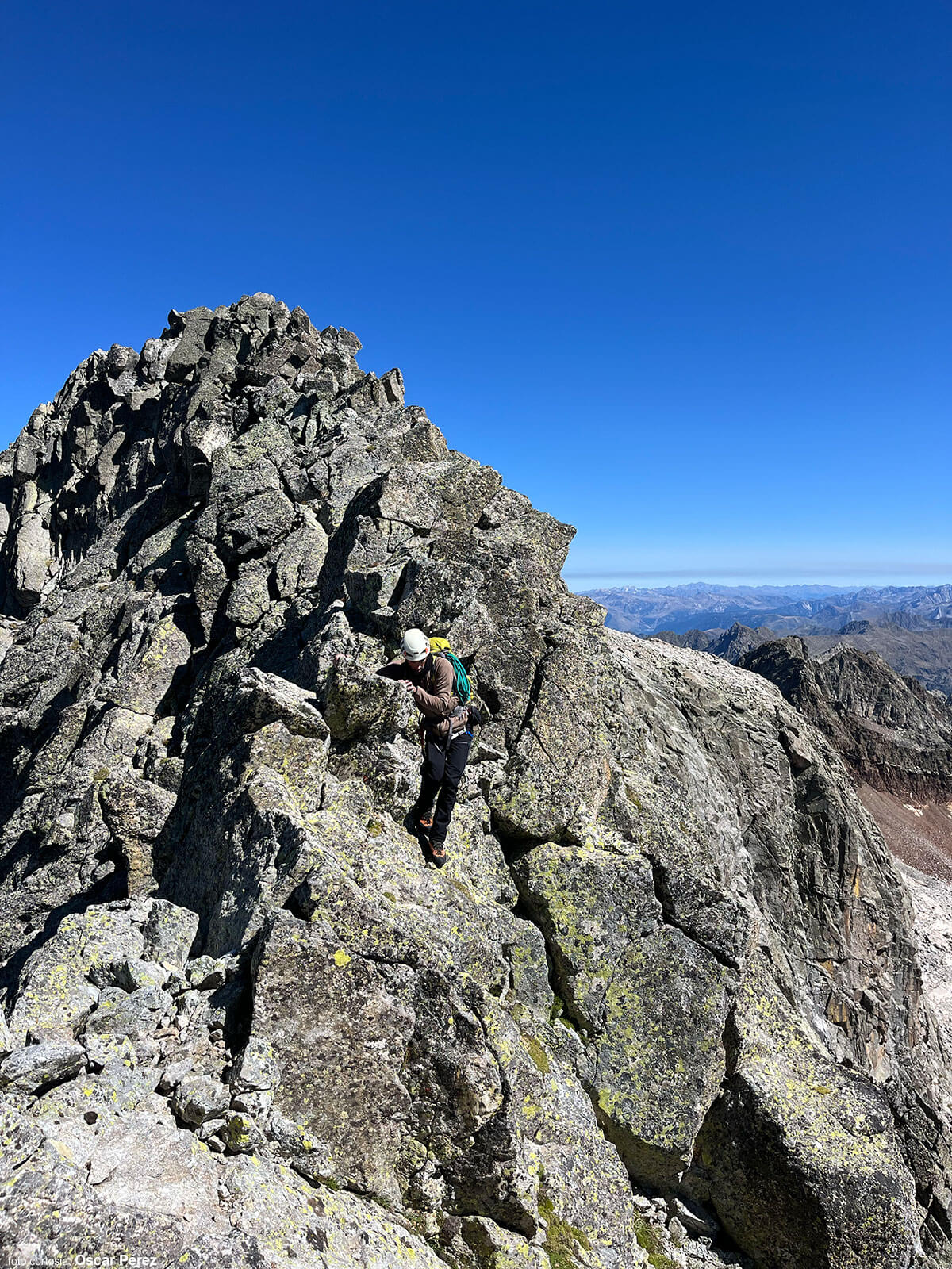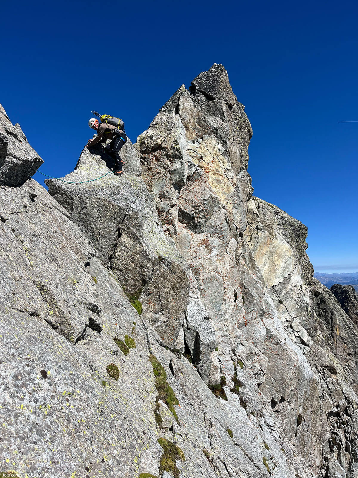 Tras un pequeño tentempié y despedirnos del montañero francés, nos dirigimos hacia la parte más técnica, expuesta e intimidante de la jornada: la cresta de Maupas. Aunque no es excesivamente compleja (pasos mayoritariamente de II+ y alguno de III), es aérea y tiene bastante patio. Como punto a favor, cuenta con una roca excelente, probablemente de las mejores que he encontrado en una cresta, que por lo general suelen estar bastante rotas.