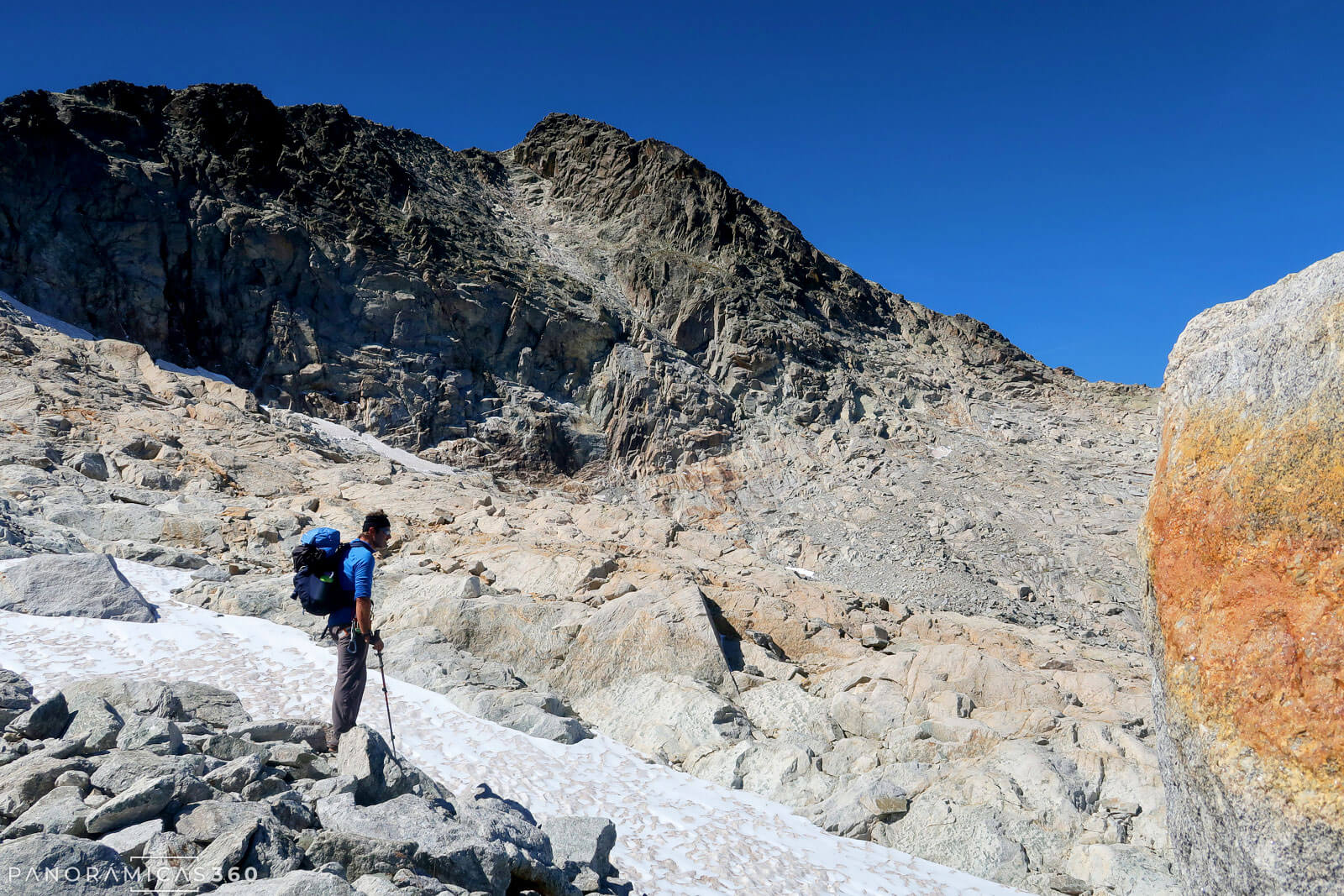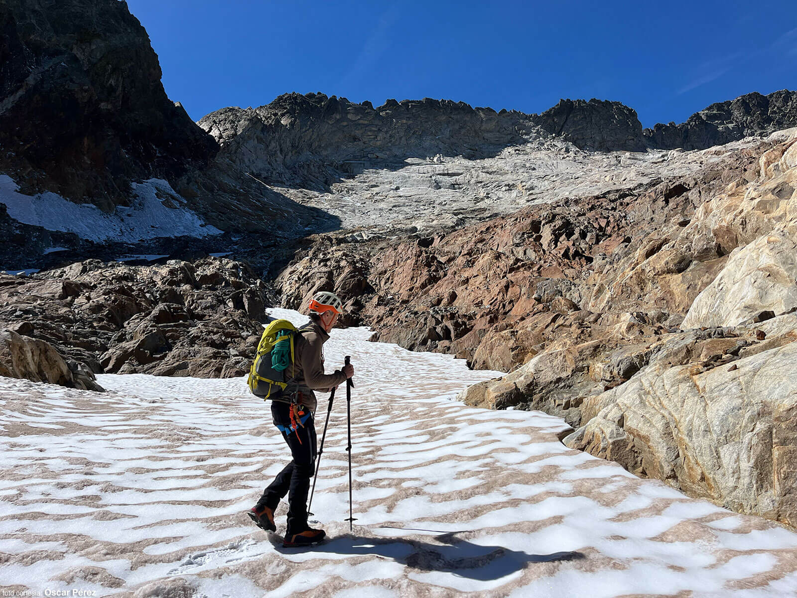Hasta aquí el terreno está descompuesto, pero al cambiar de dirección a oeste la roca se parece a la de la vertiente sur, con grandes placas de granito por las que resulta entretenido y cómodo progresar. Sin embargo, al contrario que en la vertiente española, aquí, a ratos, pisamos la nieve del glaciar de Boum, que con menos de tres hectáreas es, junto al de Las Neous (Balaïtous), Petit Vignemale y la Munia los más pequeños del Pirineo, y en grave peligro de desaparecer.