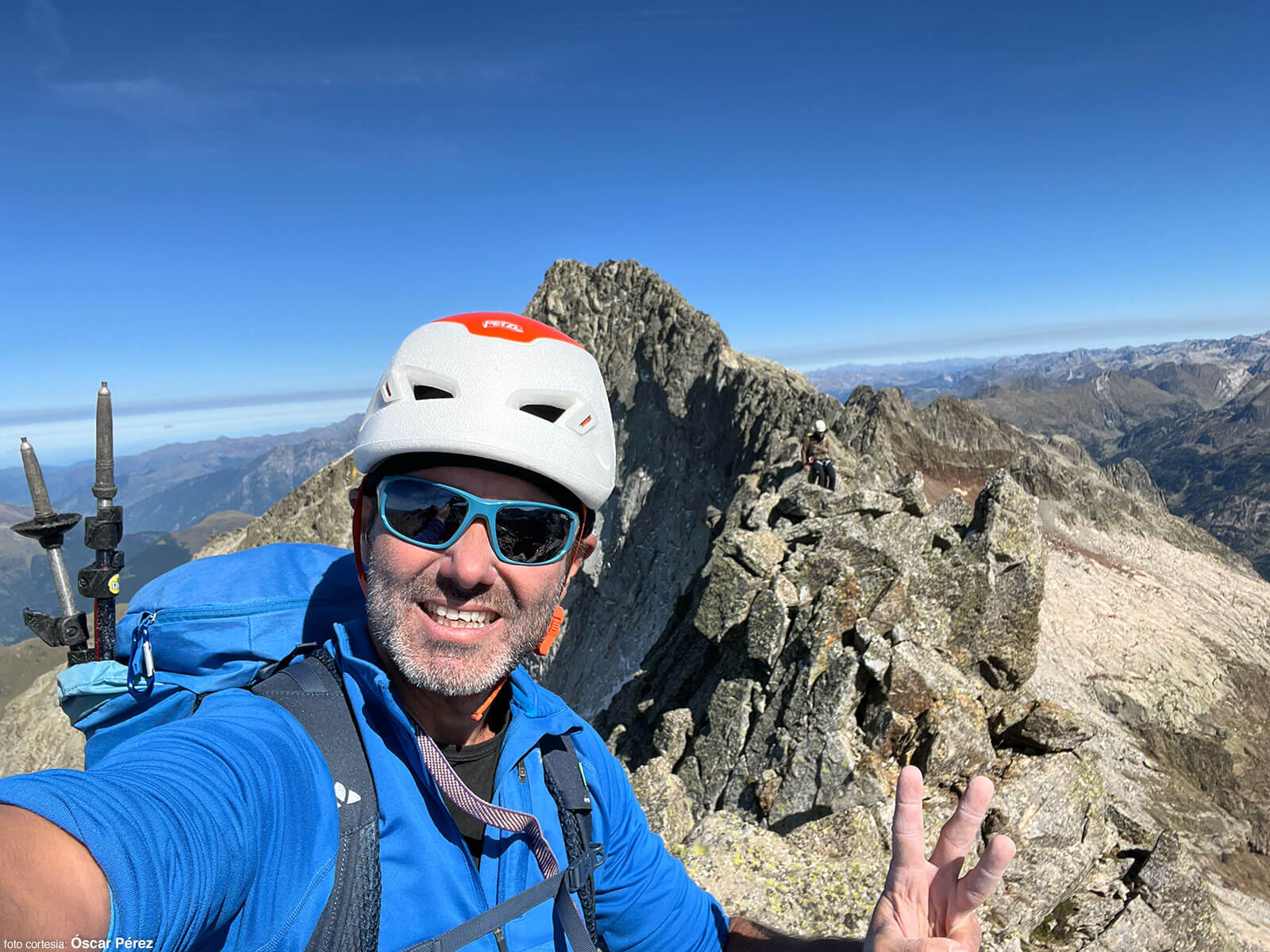 Siguiendo a Óscar llegamos al pico Navarro, y a una horcada después, sin embargo, el siguiente tramo de cresta cada uno lo afronta por donde se siente más cómodo. Óscar tiende a irse a la vertiente francesa, haciendo flanqueos técnicamente más complejos. Por mi parte progreso a plena cresta por terreno con mucho patio y ambiente pero más sencillo. Ambas opciones son expuestas, pero como la roca es buena avanzamos con seguridad y disfrutamos de la escalada.