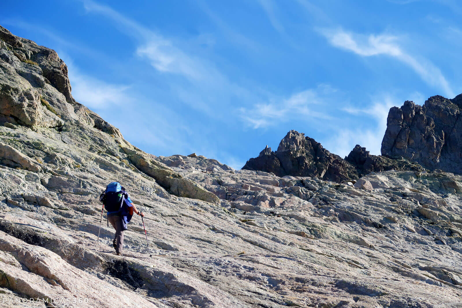 Avanzamos, en media ladera ascendente, andando, saltando entre bloques y a veces haciendo pequeñas trepadas, por canales tumbadas, en dirección a la Tusse de Maupas. El lugar es tranquilo y solitario, el día está soleado y sin viento, y da gusto recorrer este lugar.