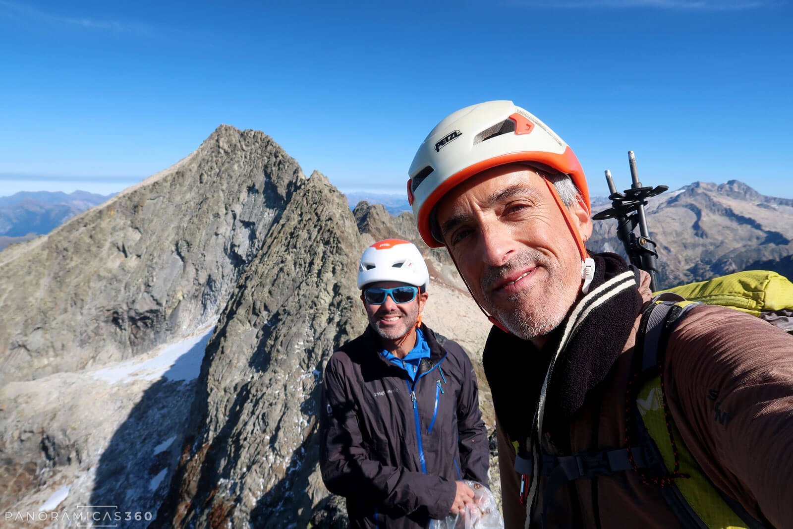 Dejamos atrás un par de instalaciones de rápel, formadas por cintas con maillon, que se utilizan para descender del pico por esta vertiente, y poco después, llegamos a una brecha en la cresta que viene del Maupas, cresta que hace de línea fronteriza con Francia. Cambiamos de dirección para afrontar la arista cimera, por la que seguimos trepando hasta alcanzar la cumbre del Pico Boum.