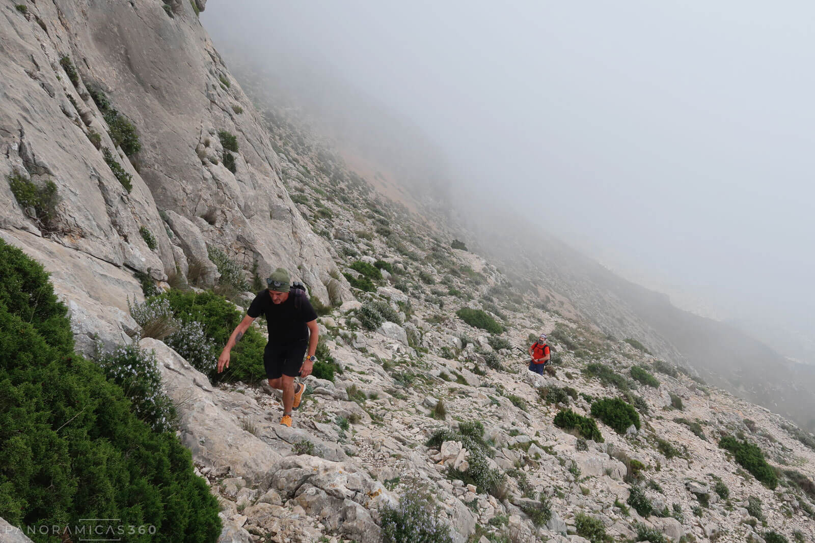 Llegamos a un destrepe equipado con cadenas, envueltos en una espesa niebla. La lluvia empieza a caer, aunque de forma suave.