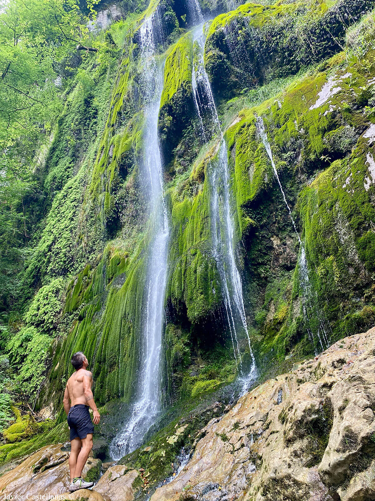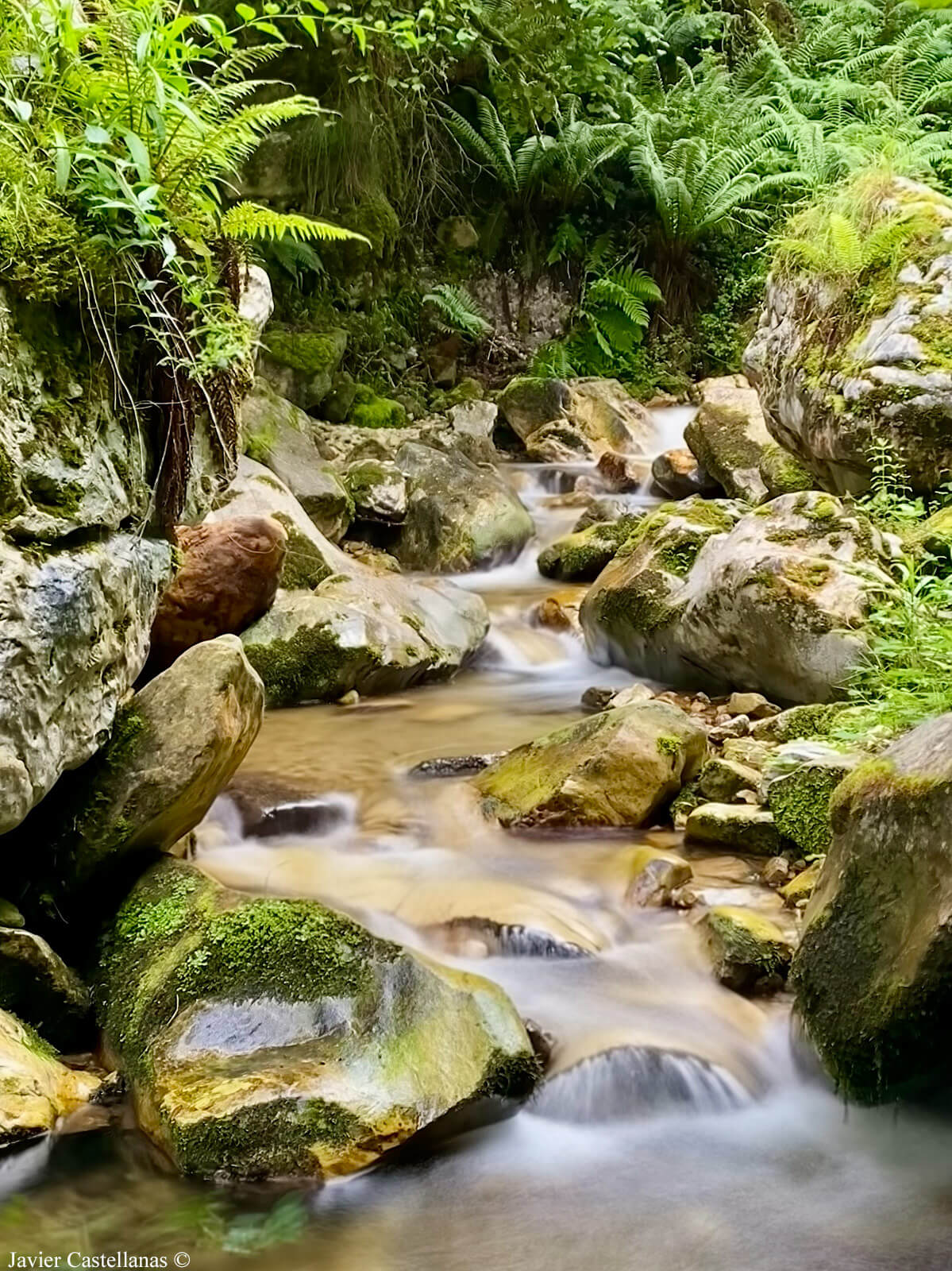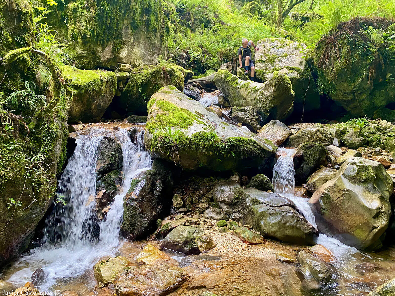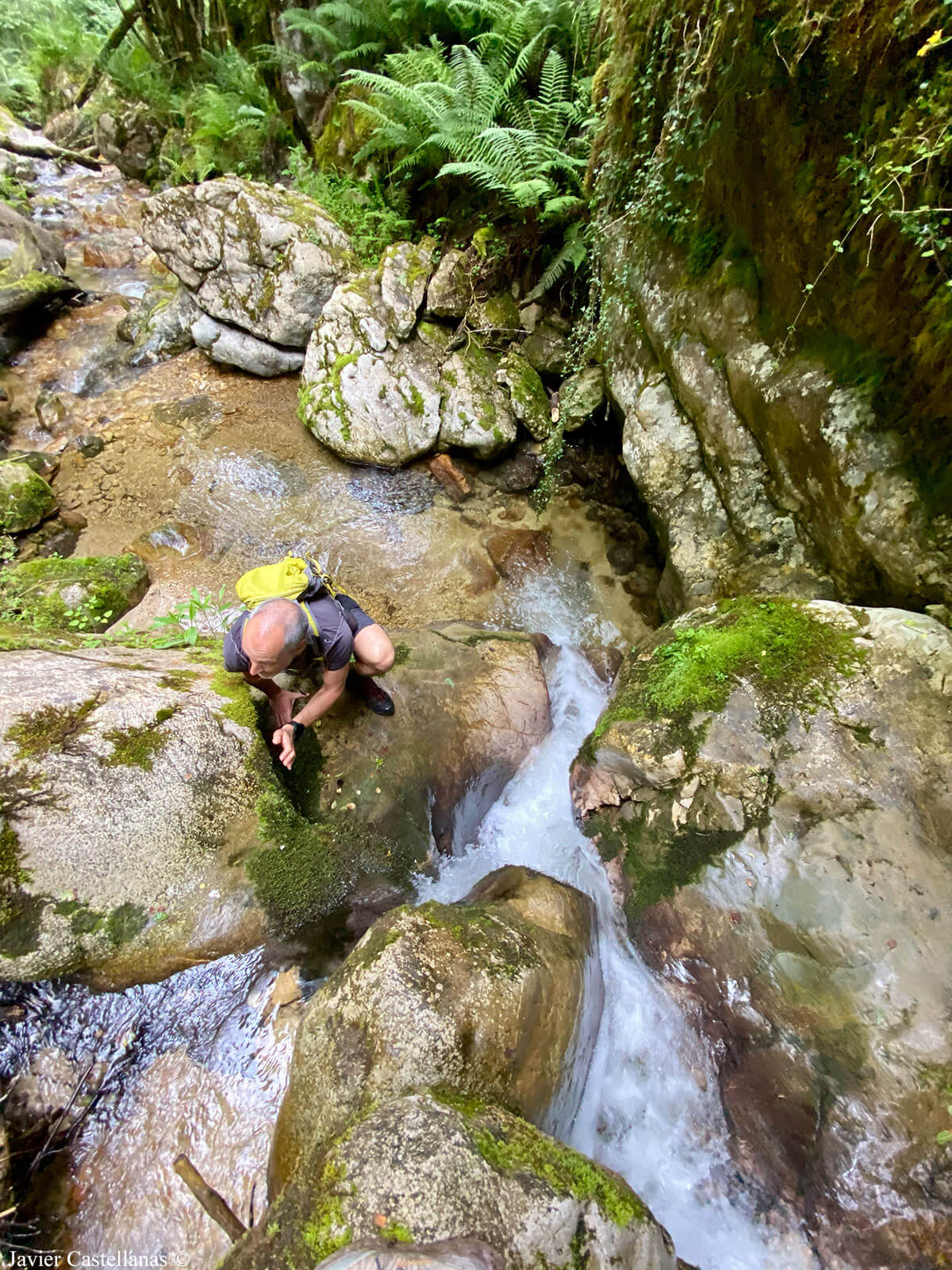 No vemos el modo de avanzar por ningún lado, así que Javi comienza a hacerlo por el cauce del río. Avanzamos de roca en roca, ayudados de las manos con cuidado porque tienen musgo, hay mucha humedad y están muy resbaladizas. Acabar en el agua entra dentro de lo posible.