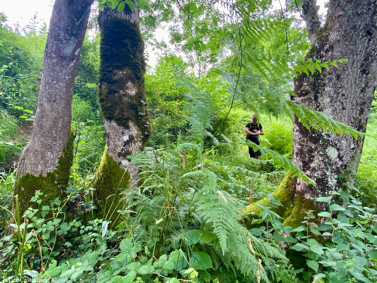 Tras las cabañas, la pista, ahora de tierra, desciende por la vertiente opuesta de la montaña, pero apenas la seguimos unos metros, para tomar una senda a la izquierda, que baja entre helechos y cruza un pequeño arroyo mediante un improvisado puente de madera.
