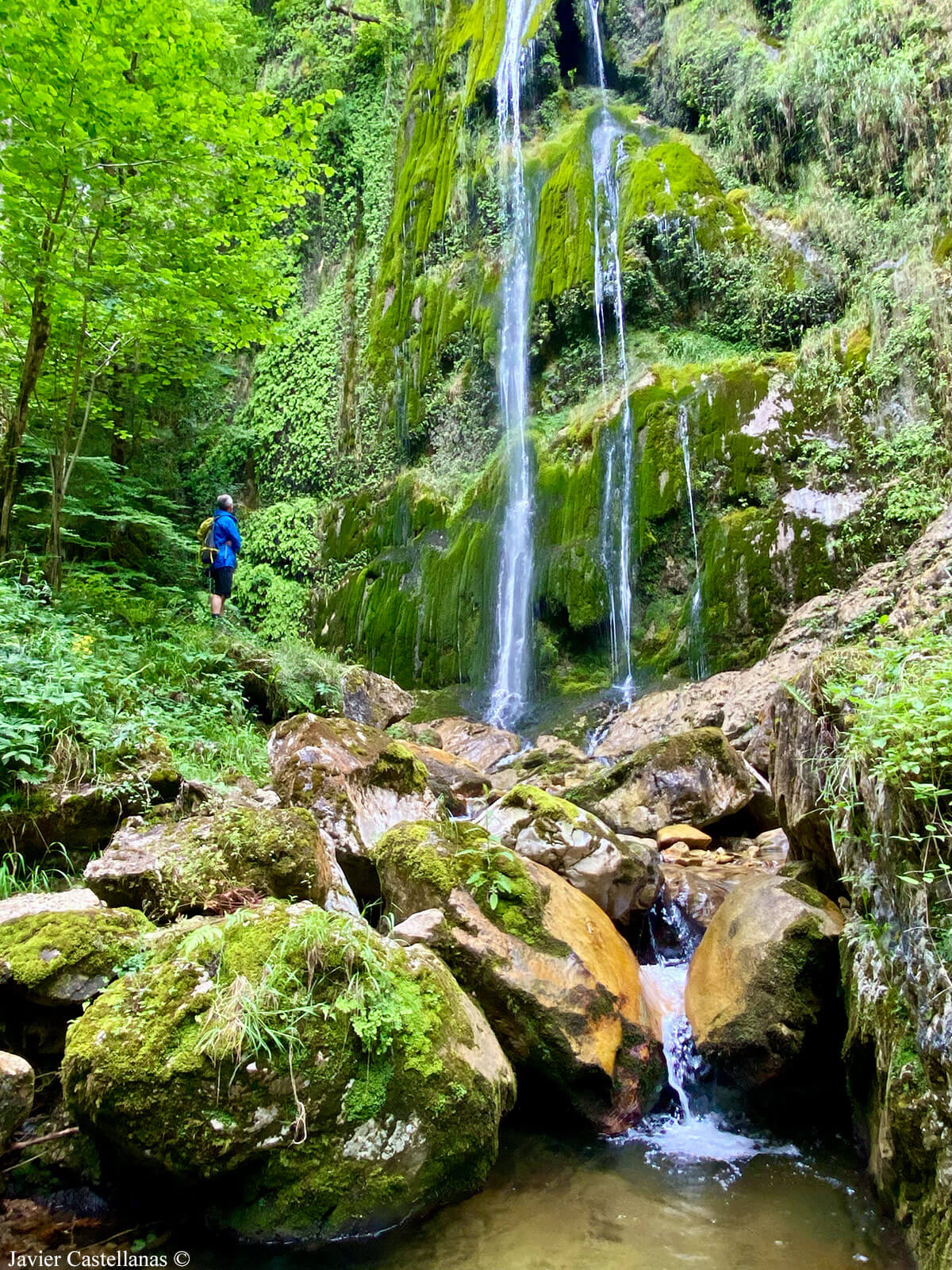 El Saltu’l Caleyu es una cascada de unos 50 metros de alto escondida en un frondoso bosque del Monte Miñances, en el concejo de Cabrales. Se alcanza por un sendero que termina difuminándose y, en nuestro caso, el tramo final lo hacemos bajando por el cauce del río al que vierte sus aguas, donde el salto aparece de golpe entre la vegetación.
