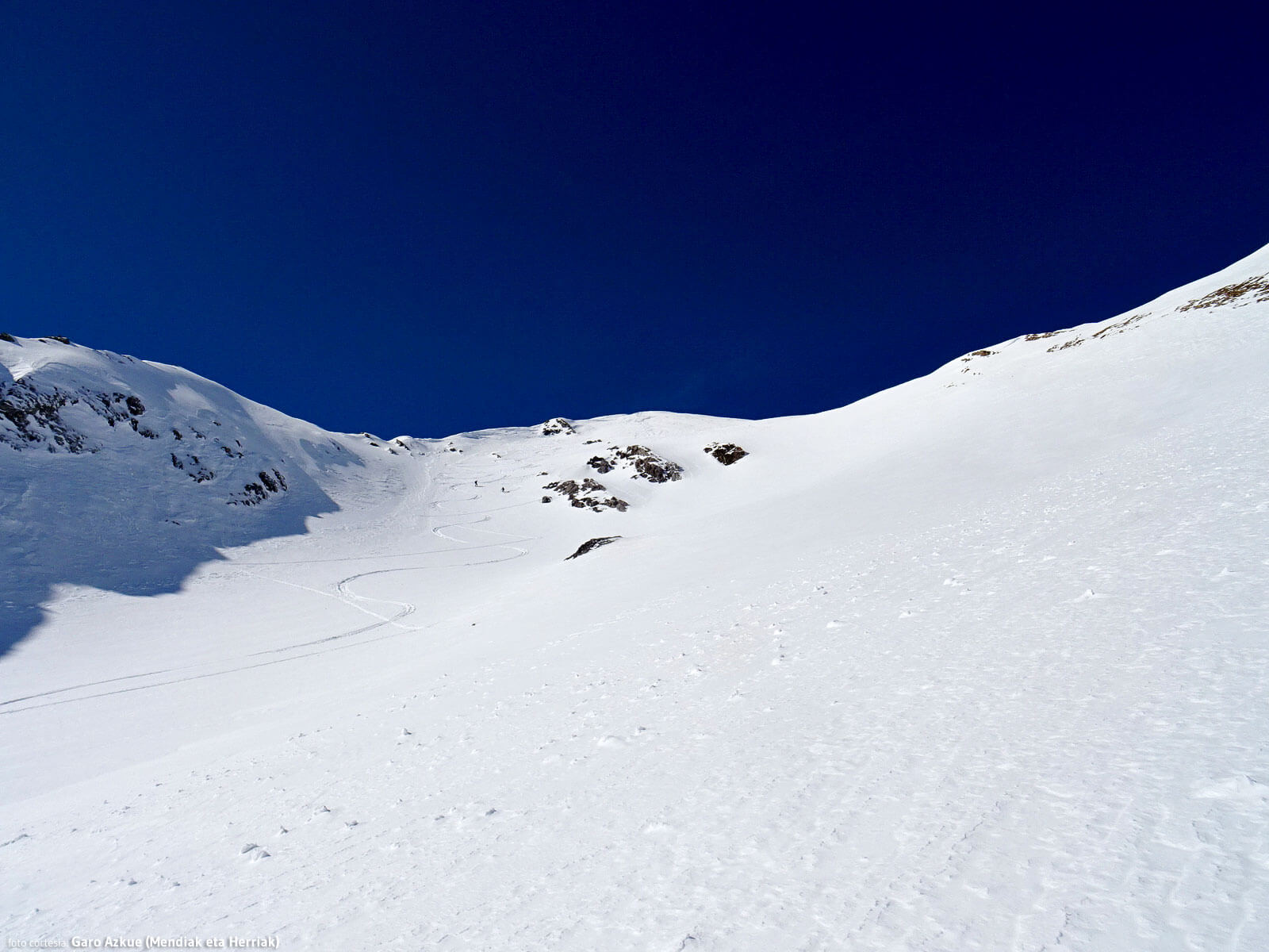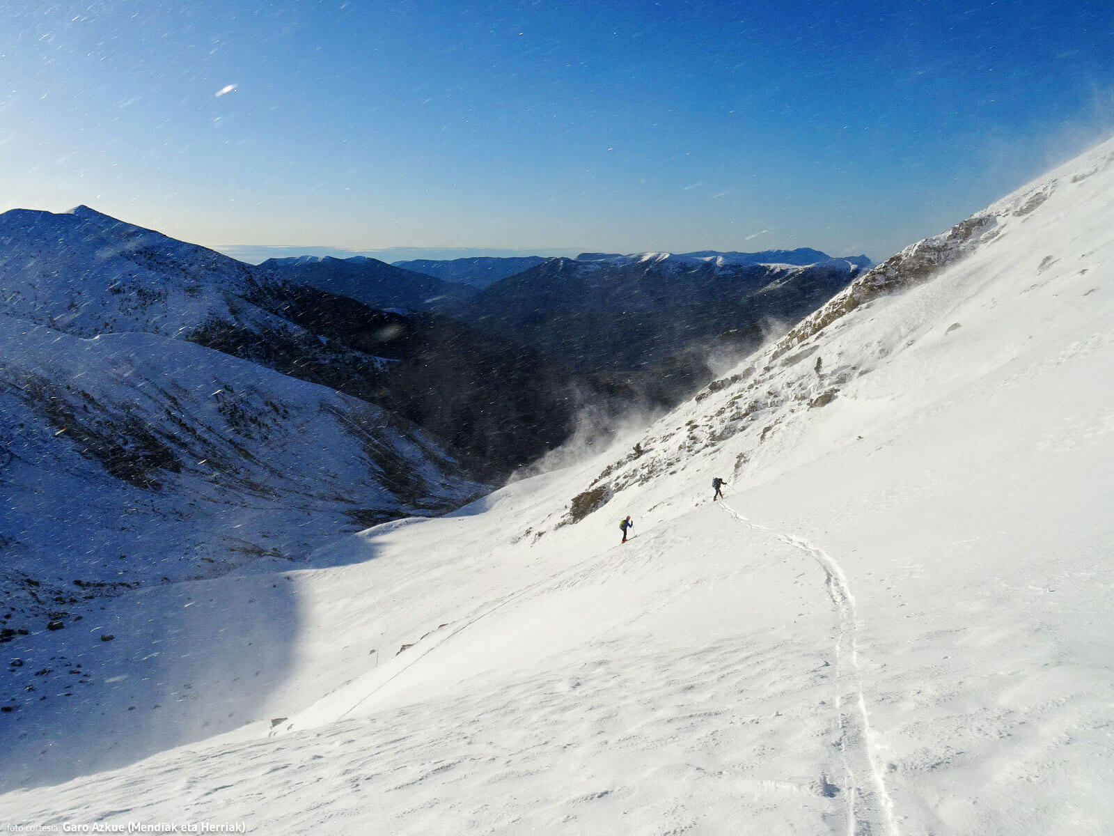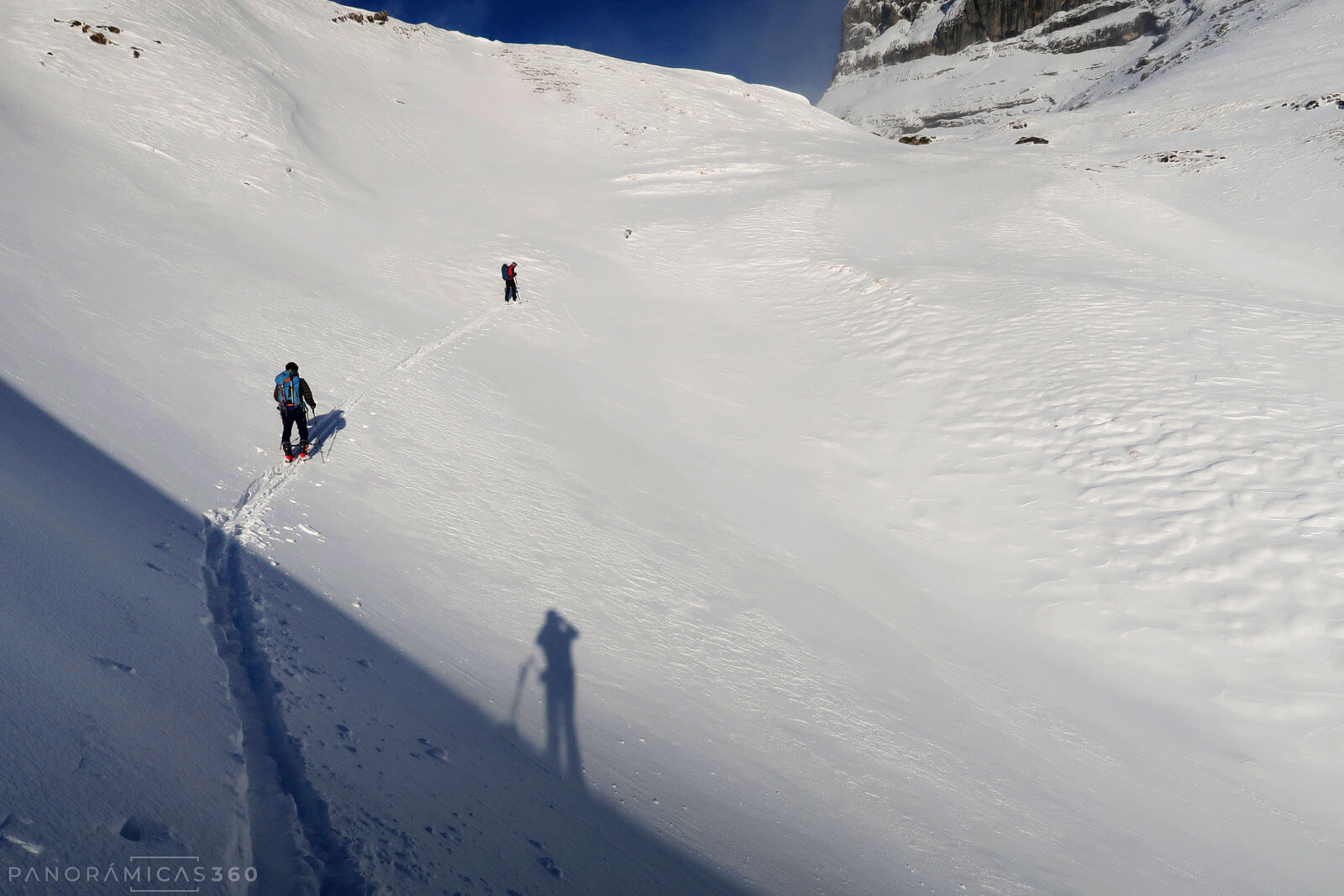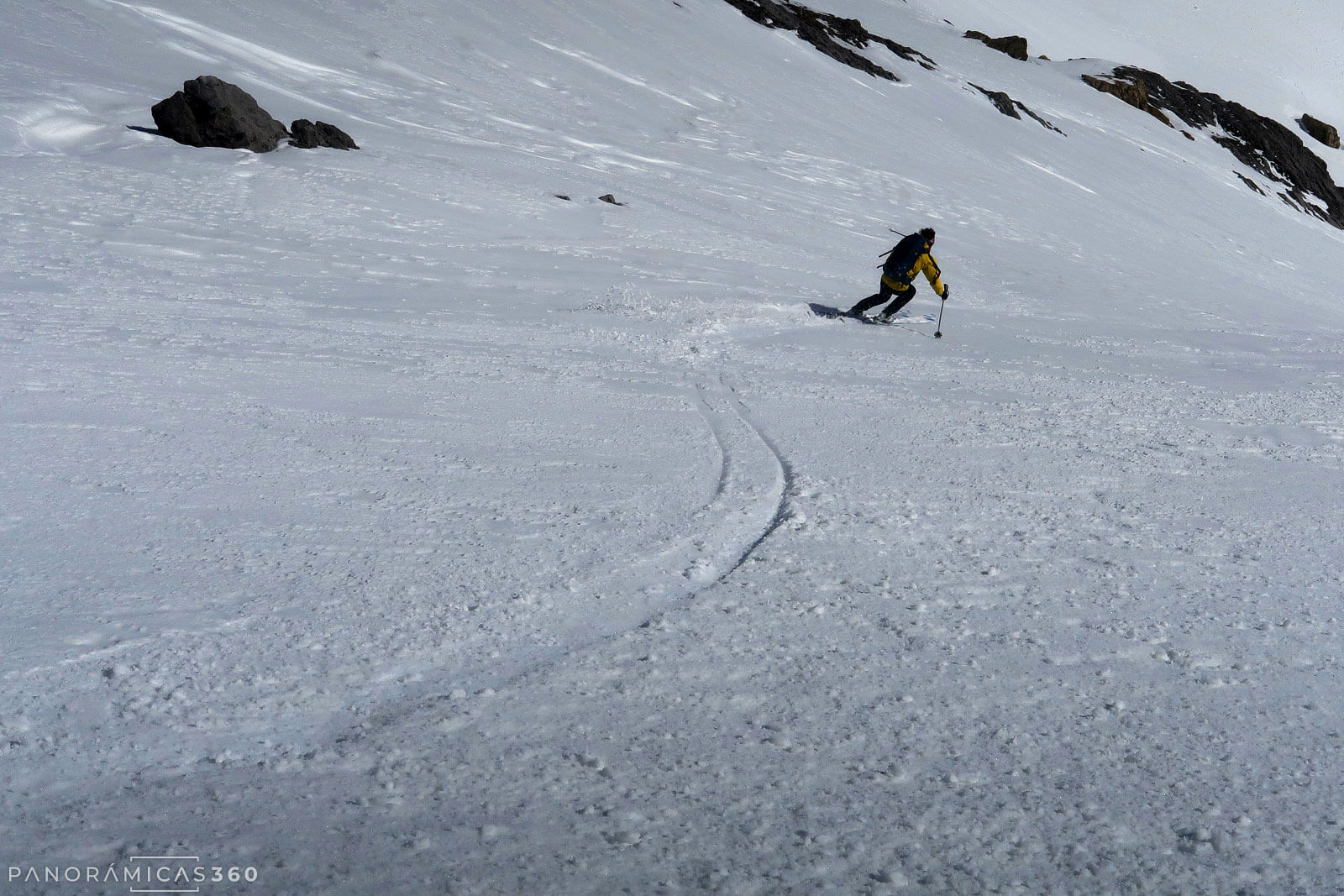 La pala somital que empieza siendo suave gana poco a poco inclinación hasta superar, en la zona más alta los 35°, por lo que avanzamos haciendo zetas y separados para evitar que un posible alud nos arrastre a todos.