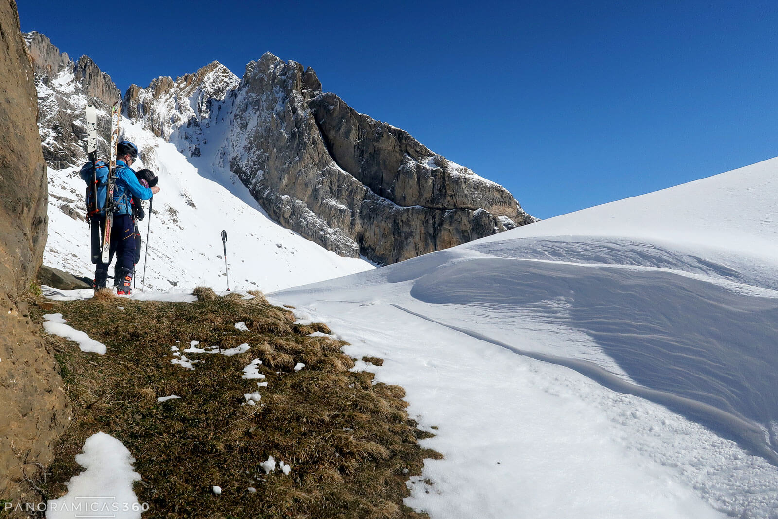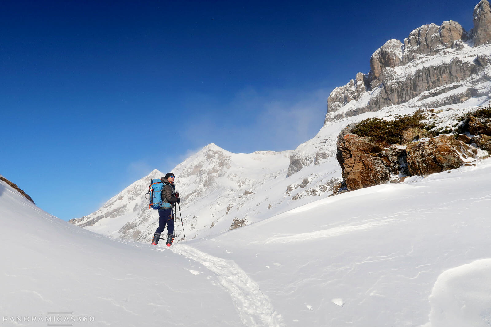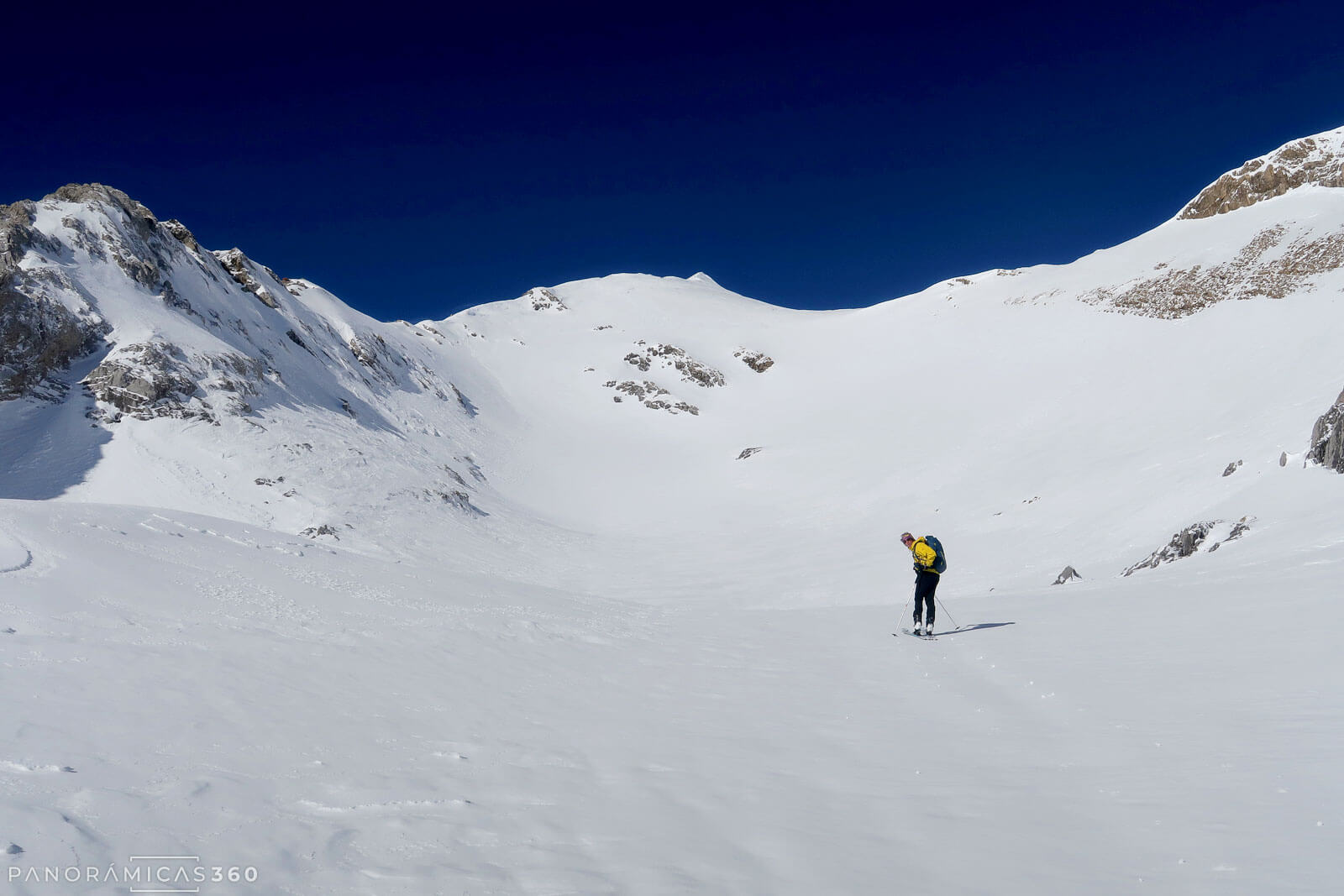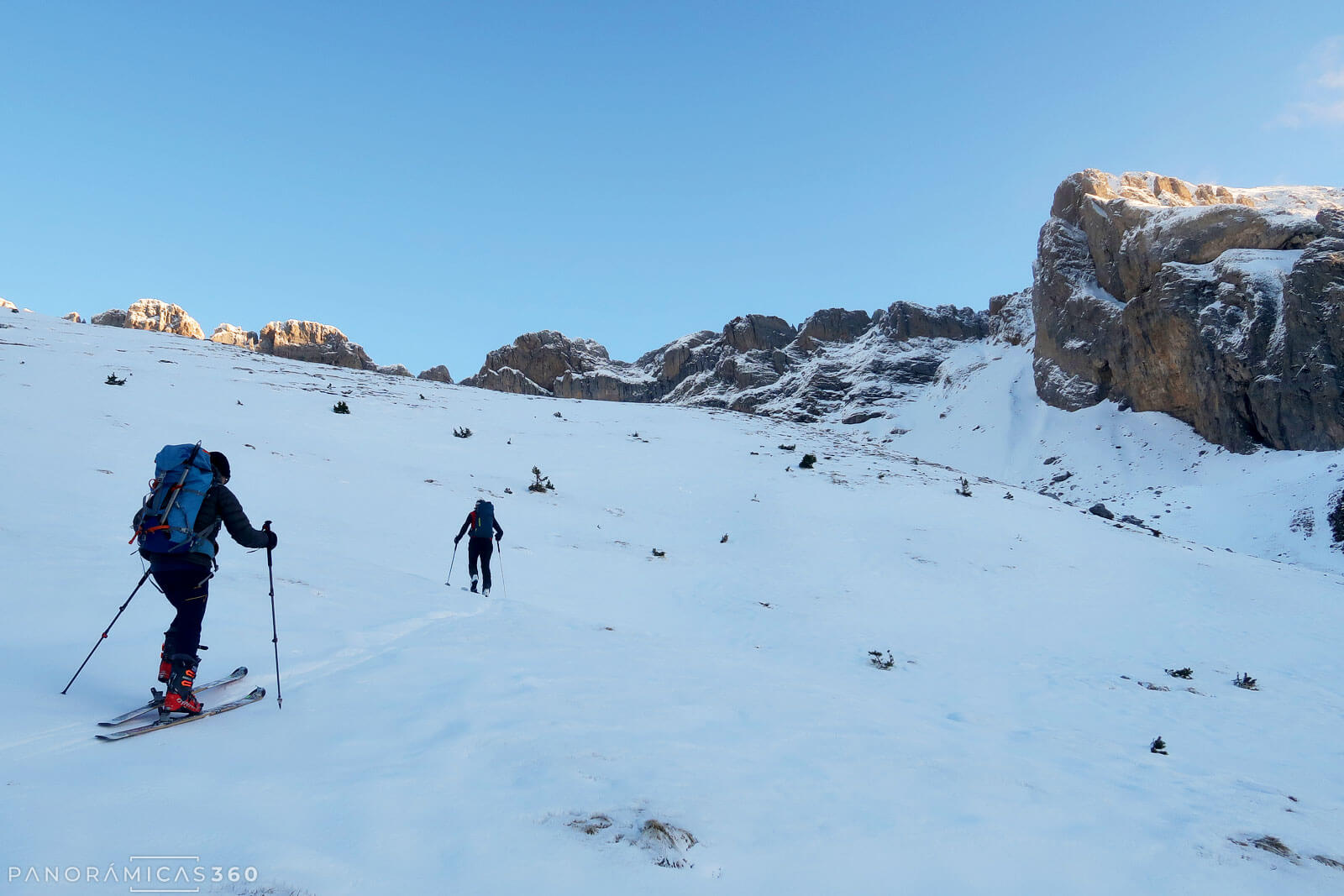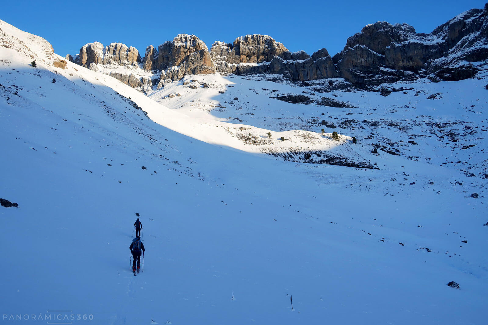No ha sido un año generoso y el manto blanco es escaso, por lo que nos toca portear los esquís hasta llegar a la primera lengua de nieve. A partir de aquí, foqueamos por una amplia vaguada con las paredes de la Sierra de Tendeñera como telón de fondo.