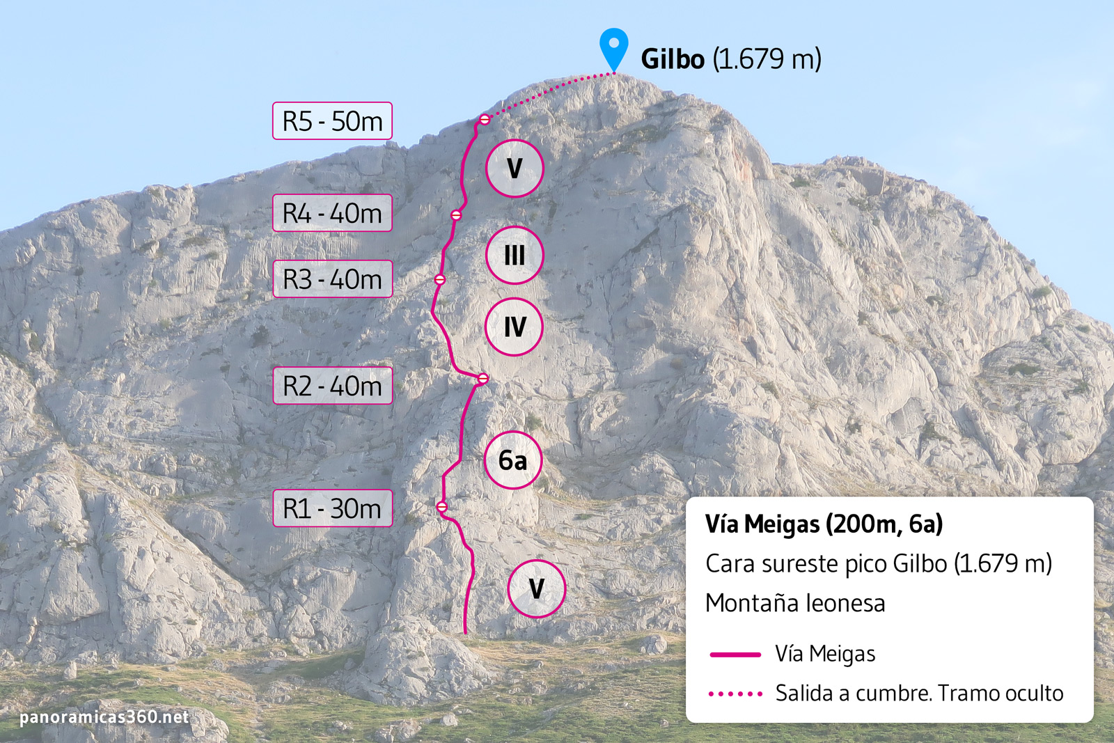 La vía Meigas al Gilbo ofrece una escalada variada, asequible y con buenas vistas. Combina tramos de roca de calidad con un entorno que, por sí solo, ya merece la visita.