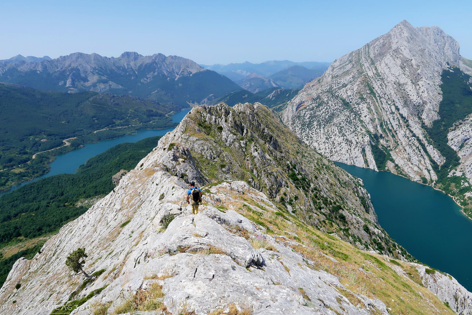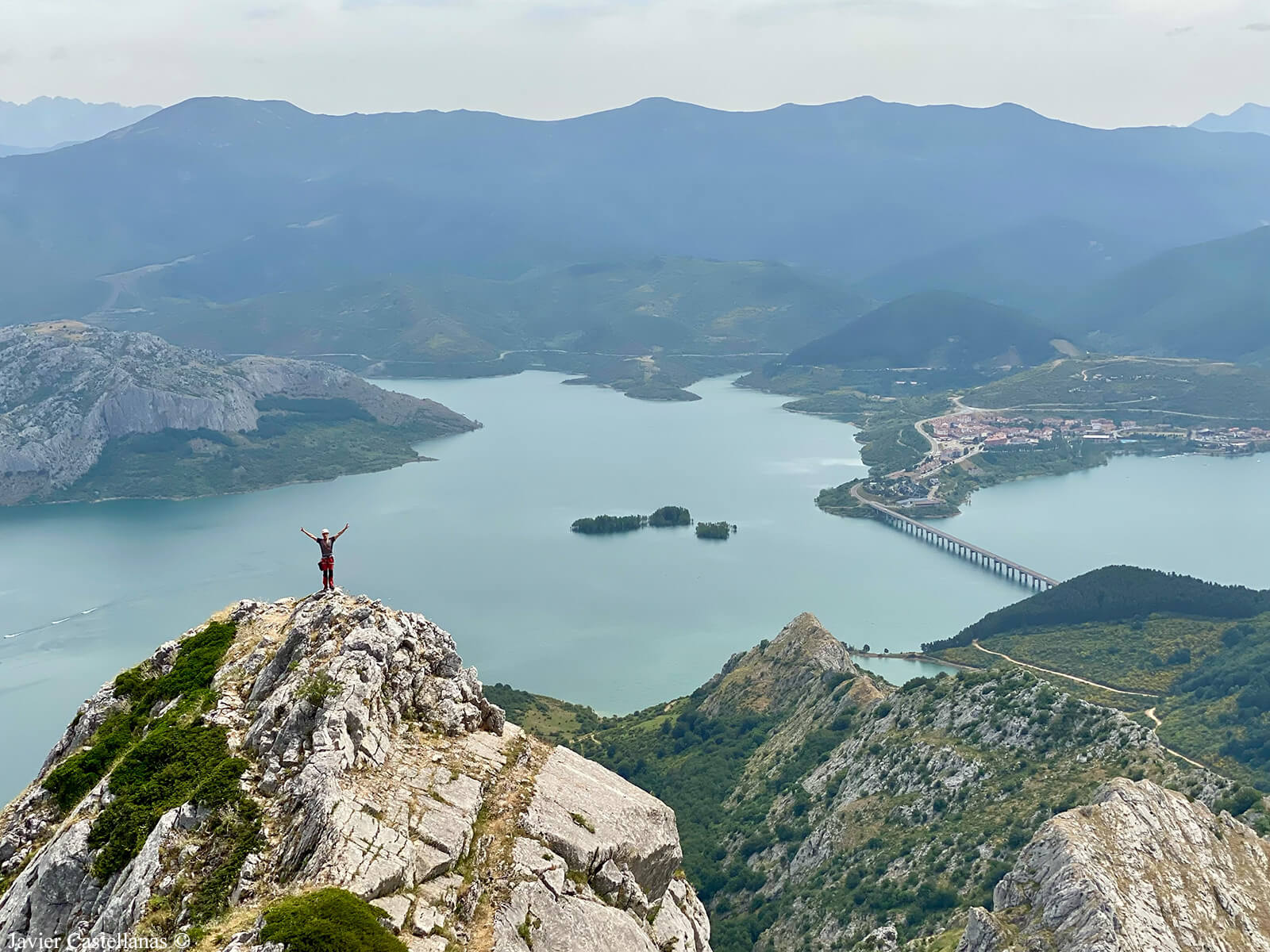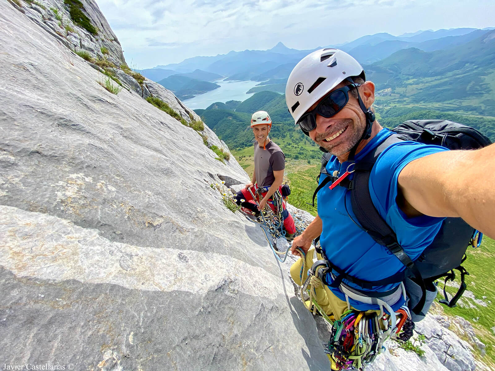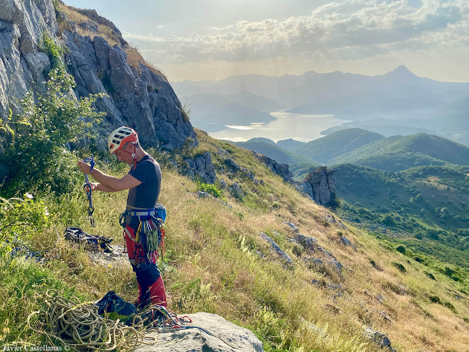 La vía Meigas, que recorre la cara sureste del Pico Gilbo, ofrece no solo la belleza de una escalada limpia, amable y fácil de proteger, sino también unas vistas privilegiadas: el embalse de Riaño se despliega a sus pies con brazos como fiordos, mientras en el horizonte se recortan los Picos de Europa y la montaña palentina, conformando uno de los paisajes más espectaculares de la Cordillera Cantábrica.