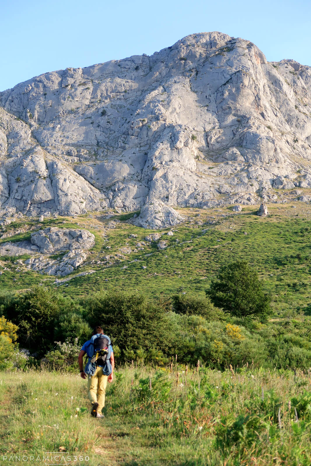 De vuelta a la pista, bordeamos un cerro cruzando un robledal hasta salir a una zona de prados donde hay un abrevadero, y cuando la pared sur del Gilbo está a la vista localizamos el pie de vía, fácil de identificar por el marcado diedro que recorre el primer largo.