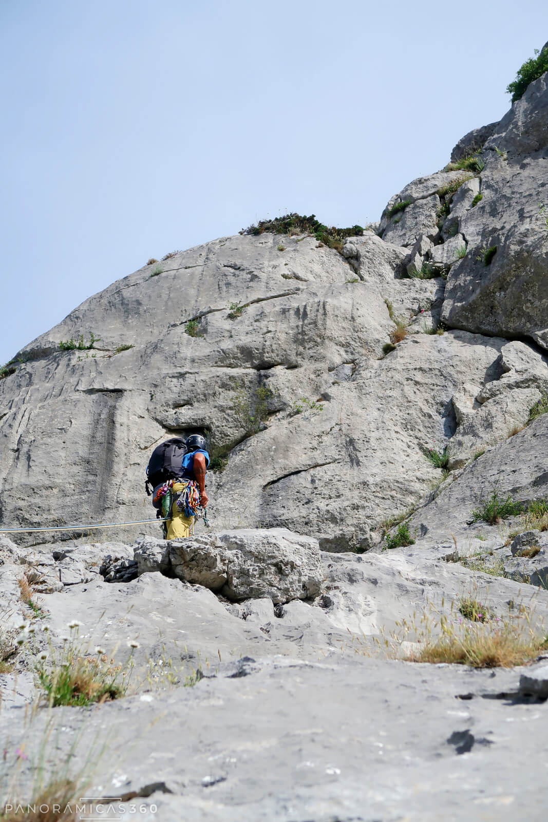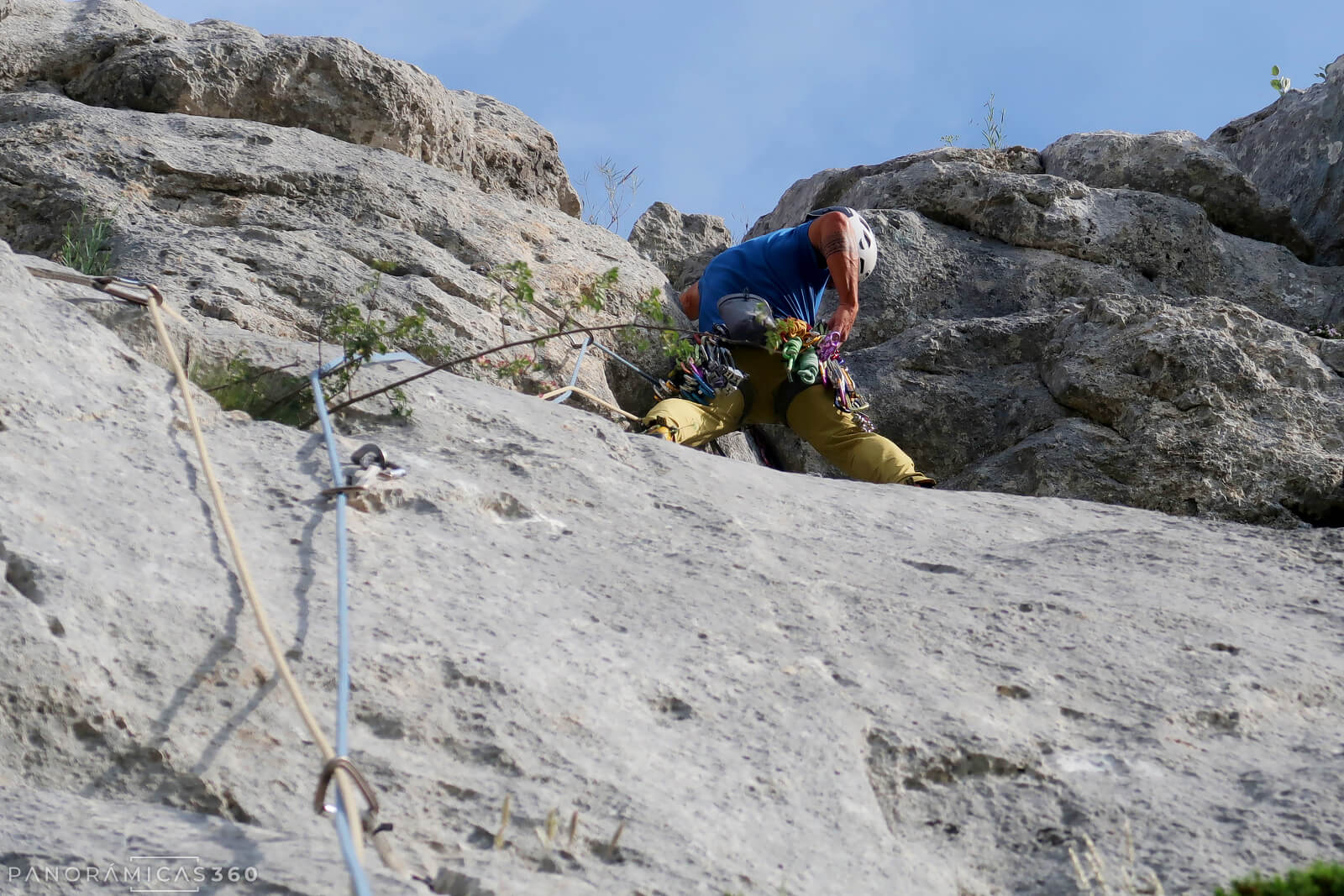La vía está equipada con lo justo: tres clavos, dos spits, un parabolt y un par de puentes de roca. Nosotros llevamos un juego de empotradores, semáforo de Aliens, los Totem verde y morado, dos Camalots y un par de cintas planas.