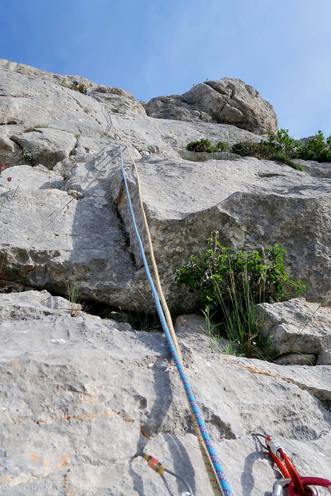 L2 (6a, 40 m): Javi toma el relevo como primero de cuerda. Empieza por una placa protegida con un spit y continúa con un ligero giro a la derecha que lleva a un pequeño desplome, bien asegurado con un clavo, un spit y un parabolt. Superado este paso, una rampa más sencilla conduce a un hombro donde monta la reunión.